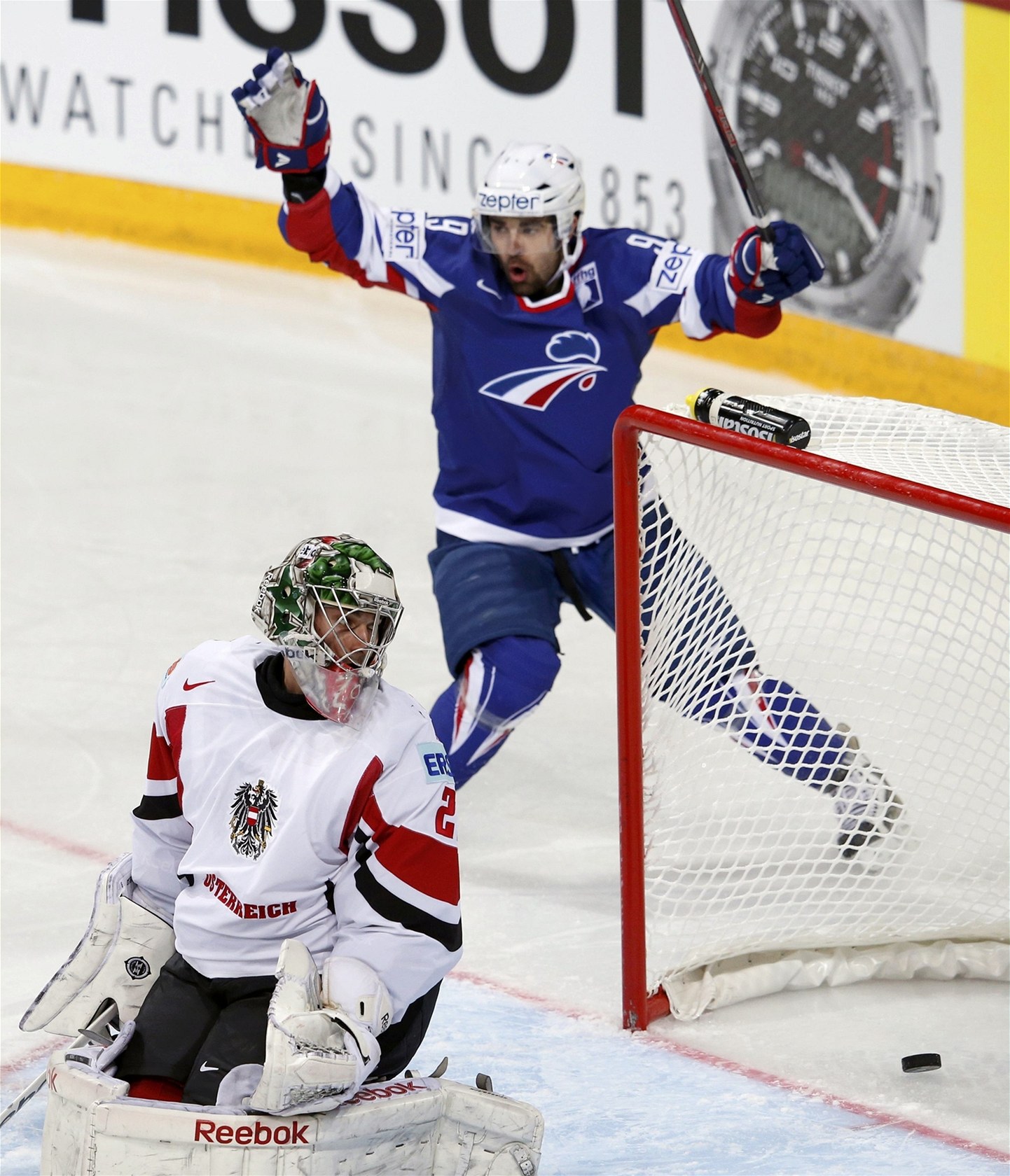 Francouzský útočník Damien Fleury se raduje z gólu v zápase s Rakouskem.