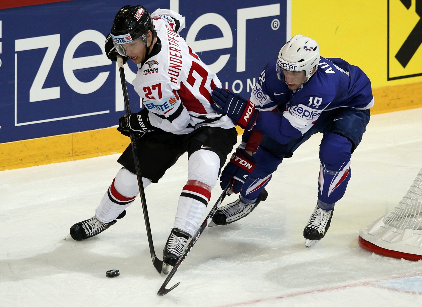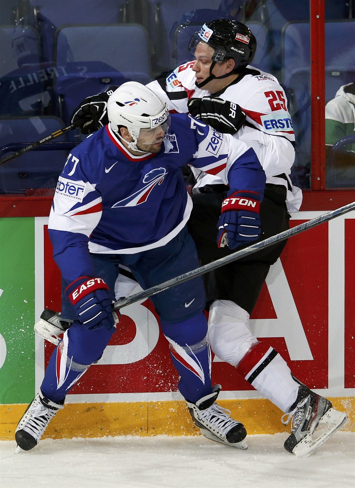 Francouzský útočník Sacha Treille (vlevo) v souboji s Rakušanem Matthiasem Ibererem.