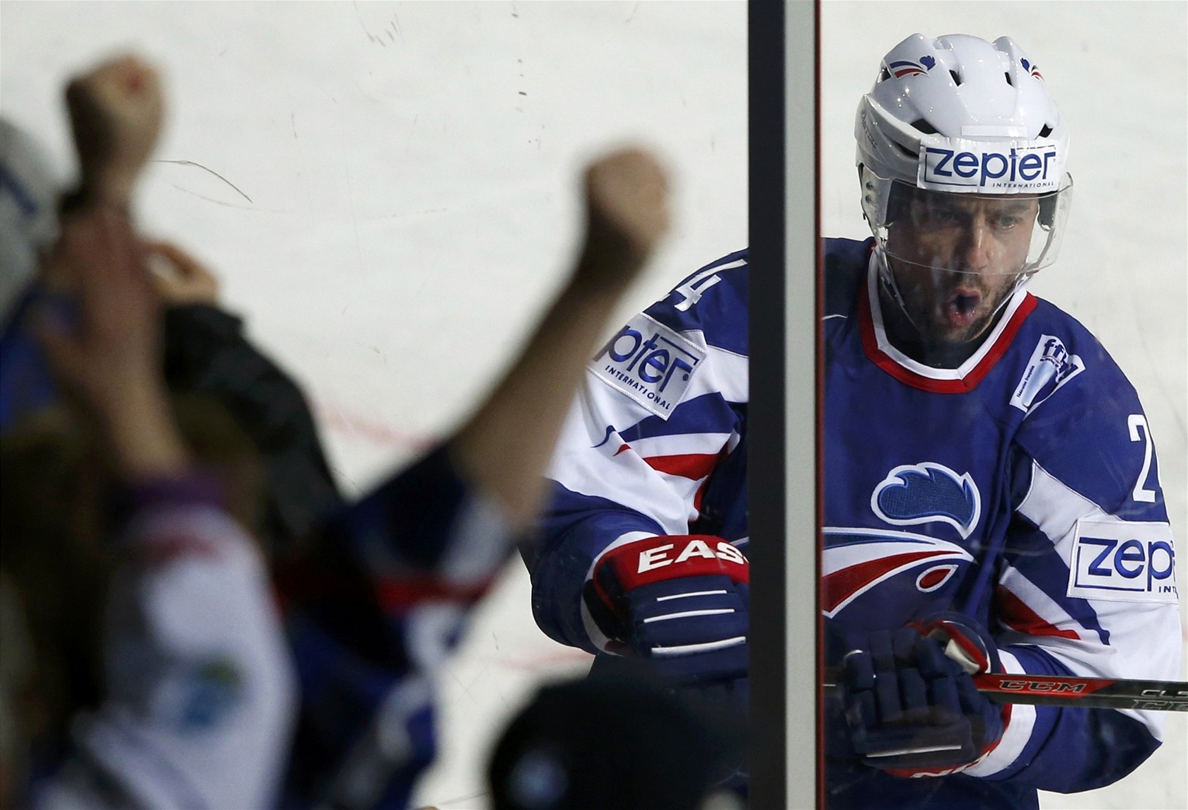 Francouzský hokejista Julien Desrosiers se raduje z gólu v zápase s Rakouskem.