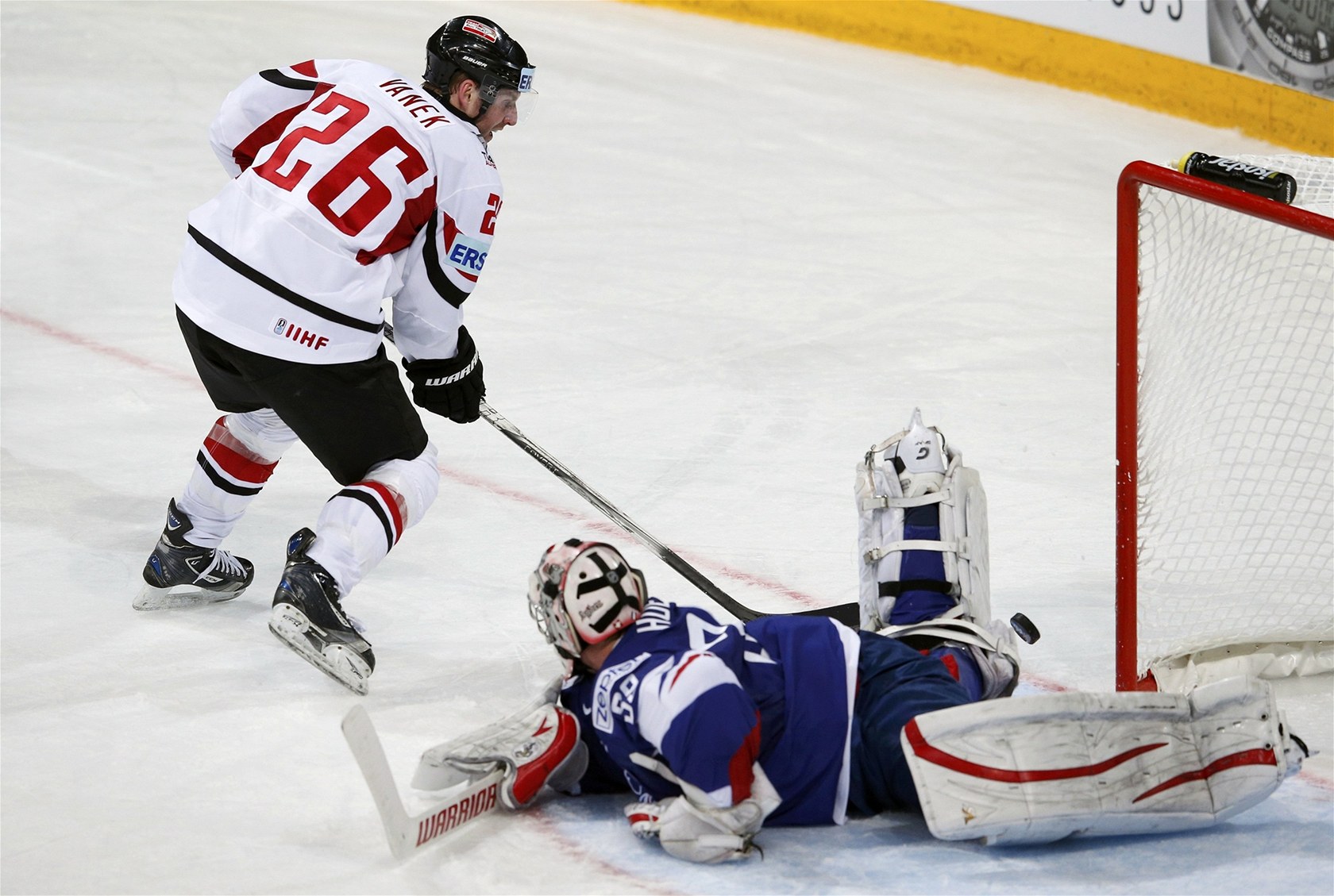 Francouzský gólman Cristobal Huet likviduje šanci rakouského útočníka Thomase Vaneka.