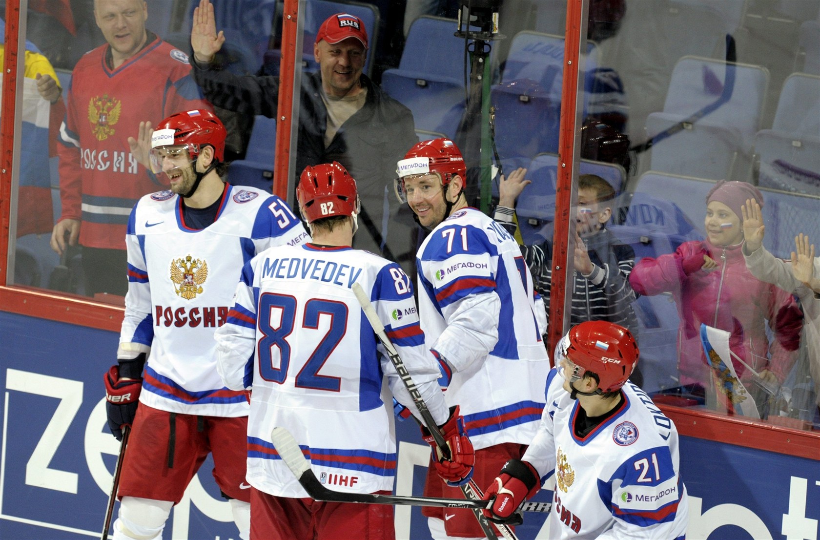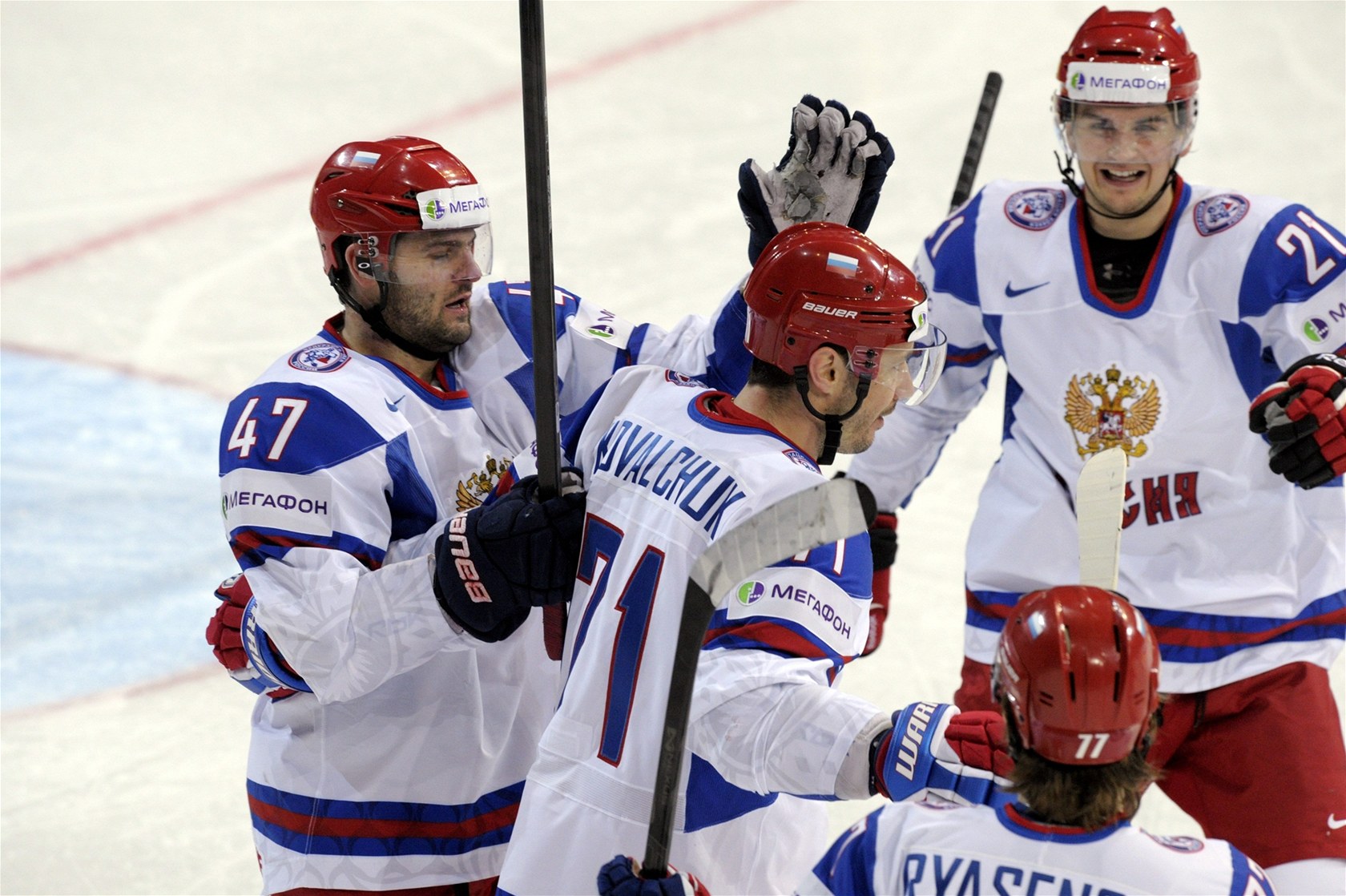 SKVĚLE, ILJO! Ruští hokejisté gratulují Ilju Kovalčukovi ke gólu proti Německu.