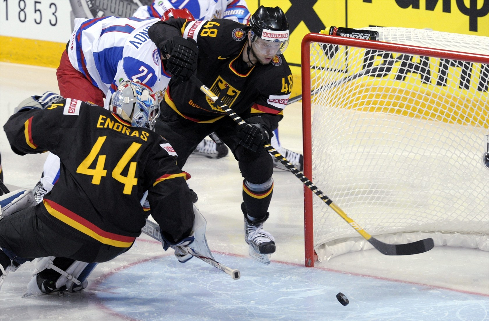 PRYČ S TÍM PUKEM. Německý gólman Dennis Endras a jeho spoluhráč Frank Hordler se brání ruskému útoku.