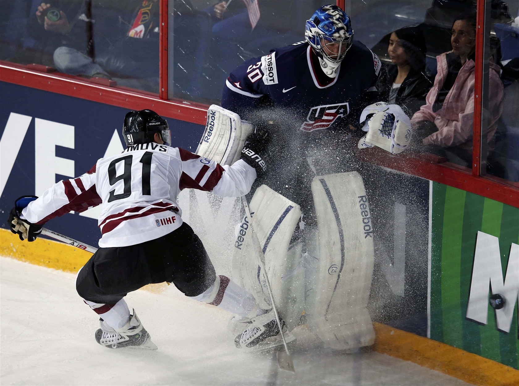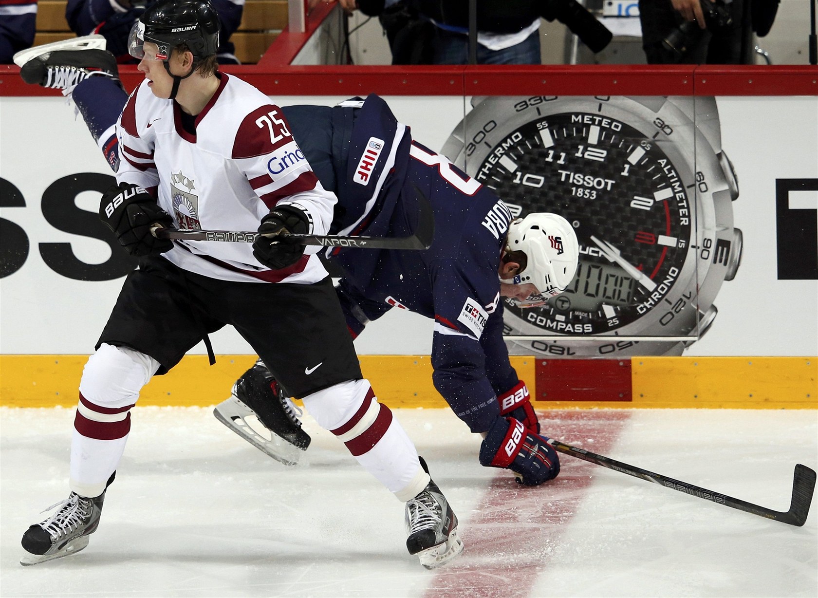 NEUSTÁL TO. Americký hokejista Jacob Trouba padá po souboji s Andrisem Dzerinsem z Lotyšska.