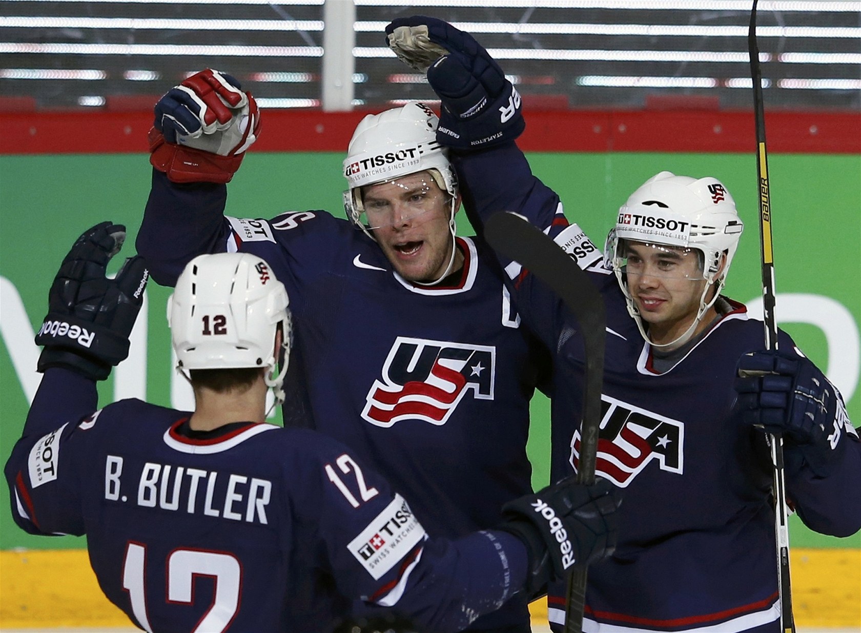 POHODA. Hokejisté USA oslavují jeden ze čtyř gólů proti Lotyšsku.