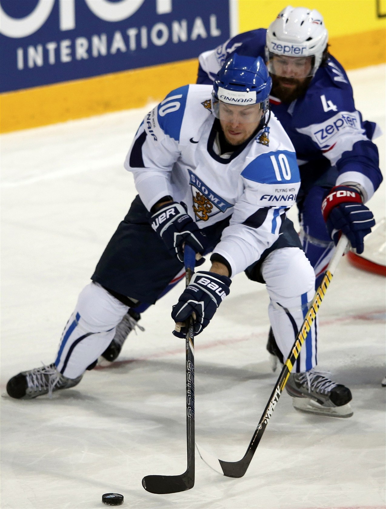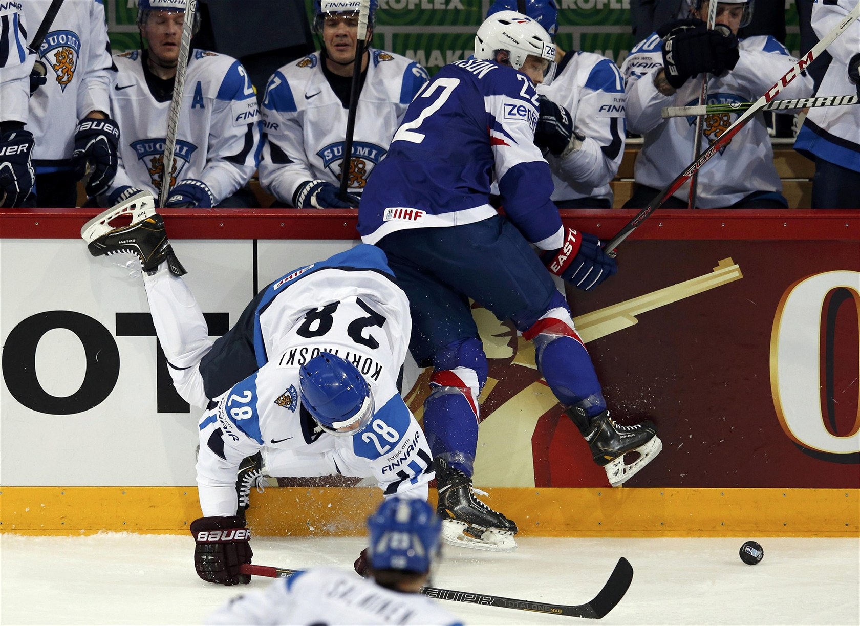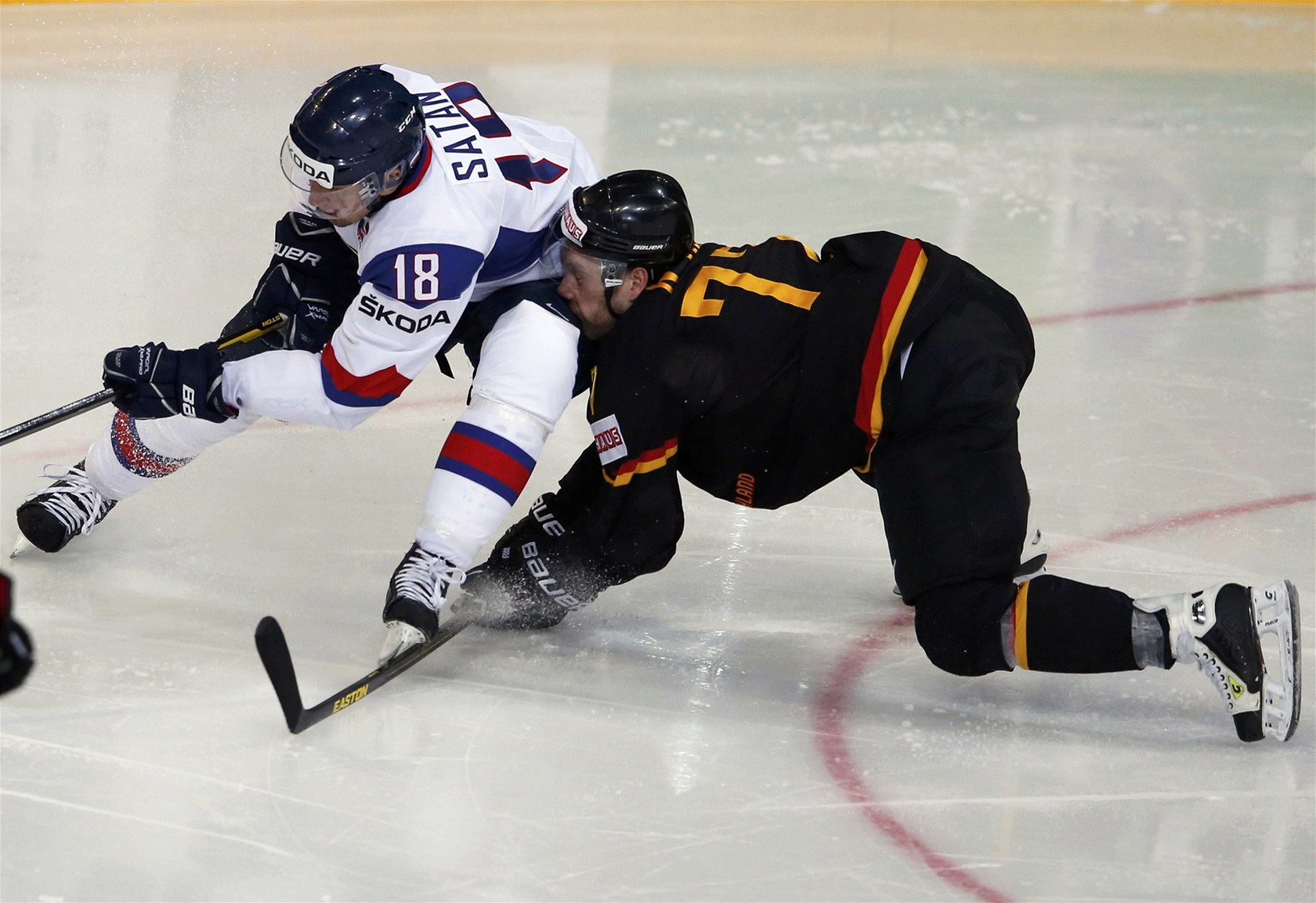 Slovenský útočník Miroslav Šatan (vlevo) bojuje o puk s Nikolajem Gocem z týmu Německa.