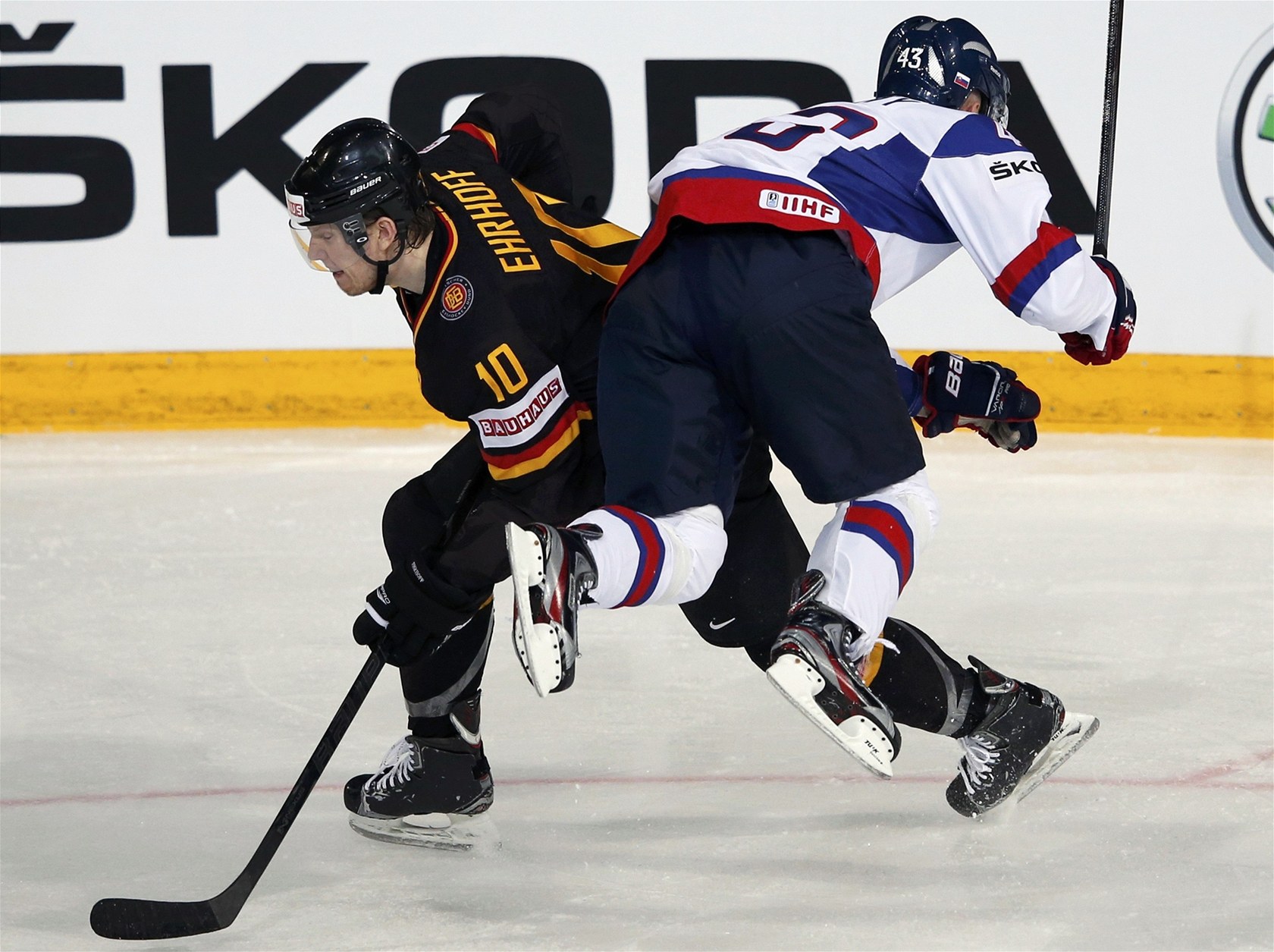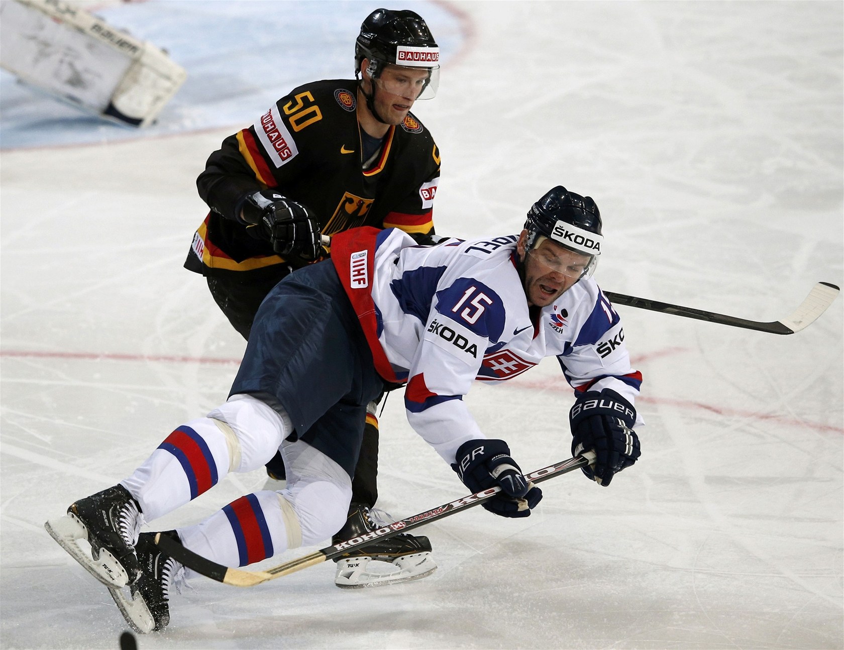 Německý obránce Christian Ehrhoff (vlevo) při střetu se slovenským reprezentantem Tomášem Surovým.