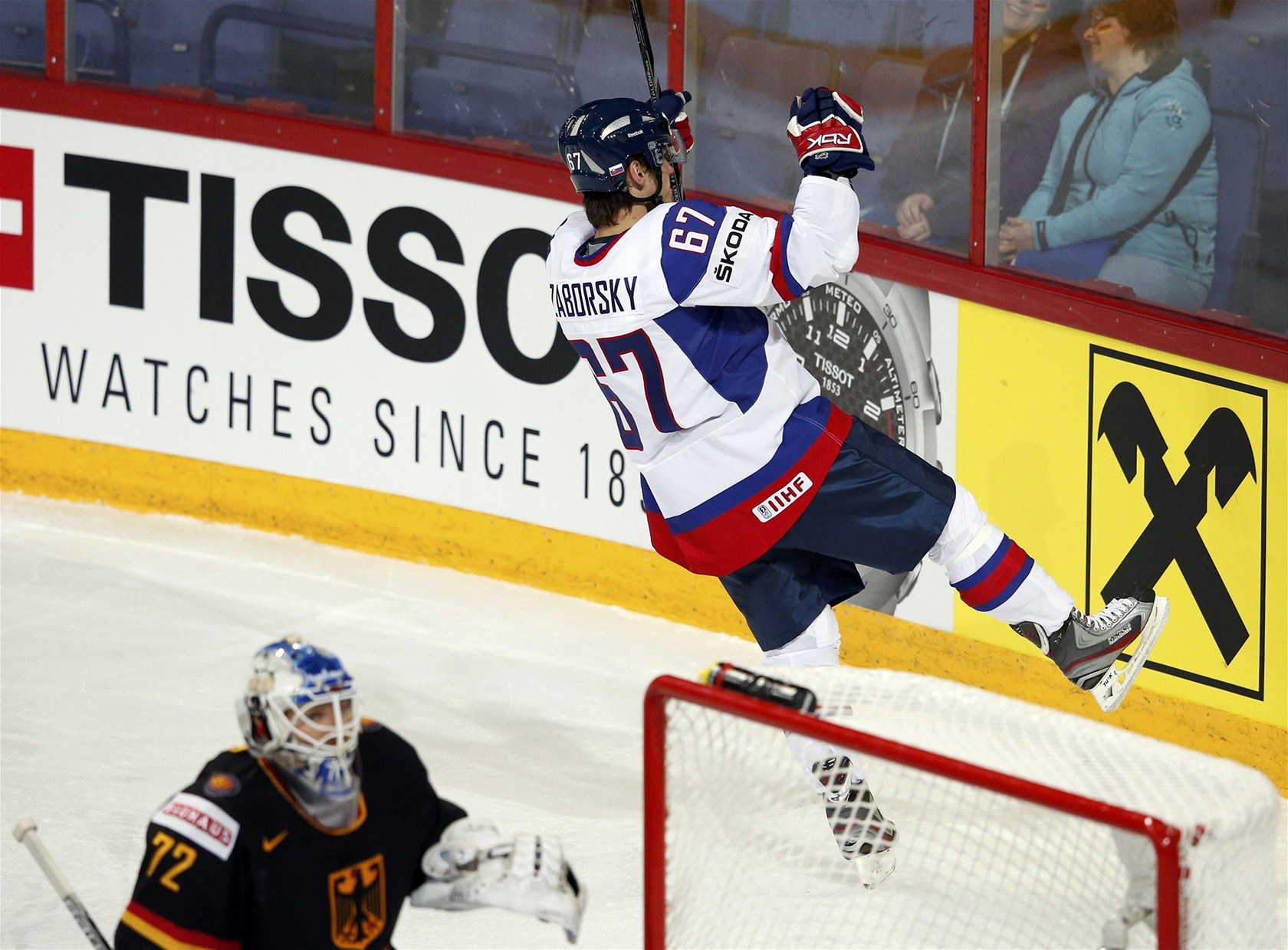 Slovenský útočník Tomáš Záborský se raduje z jednoho ze svých dvou gólů v zápase s Německem.