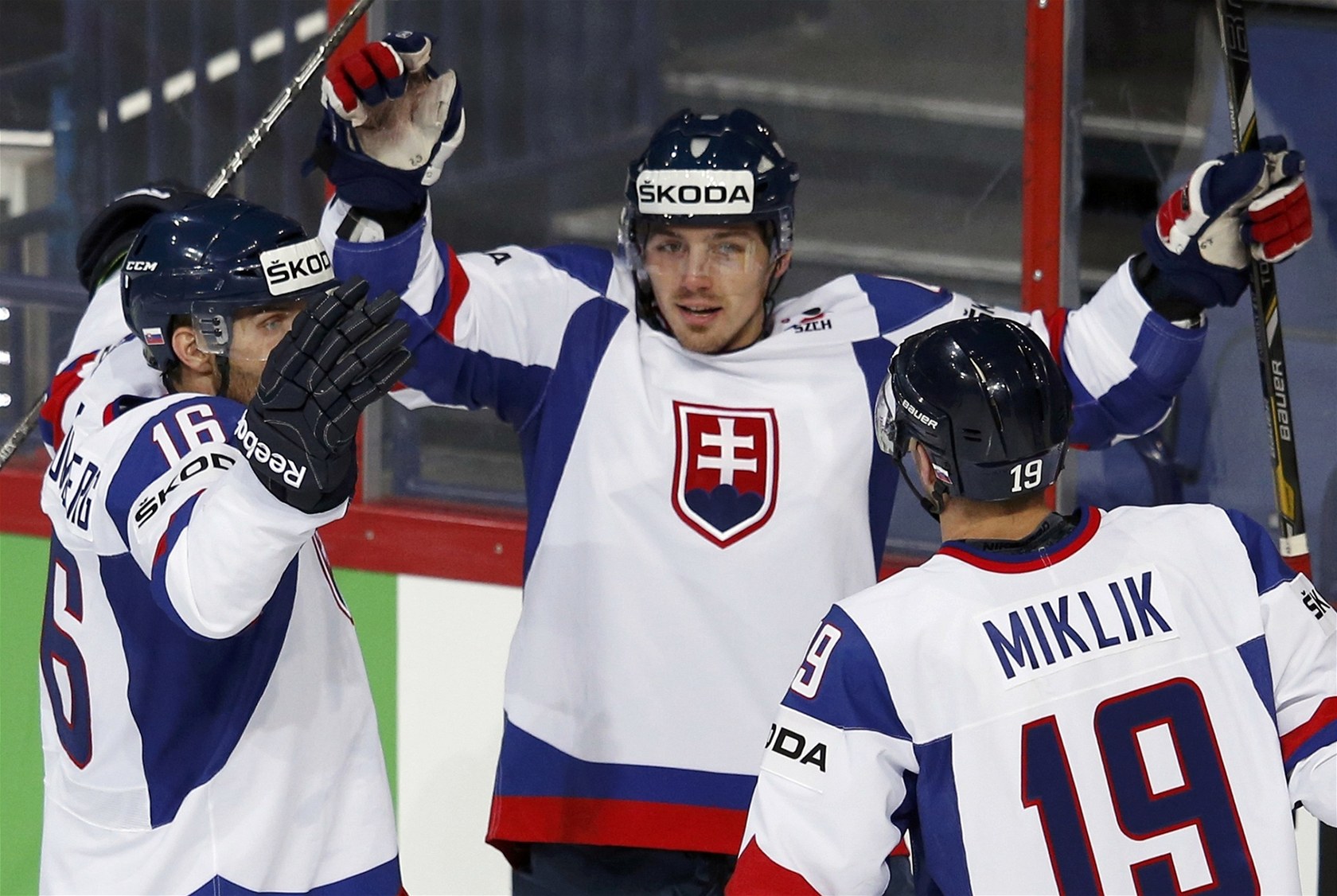 Slovenský útočník Tomáš Záborský (uprostřed) se raduje z jednoho ze svých dvou gólů v zápase s Německem.