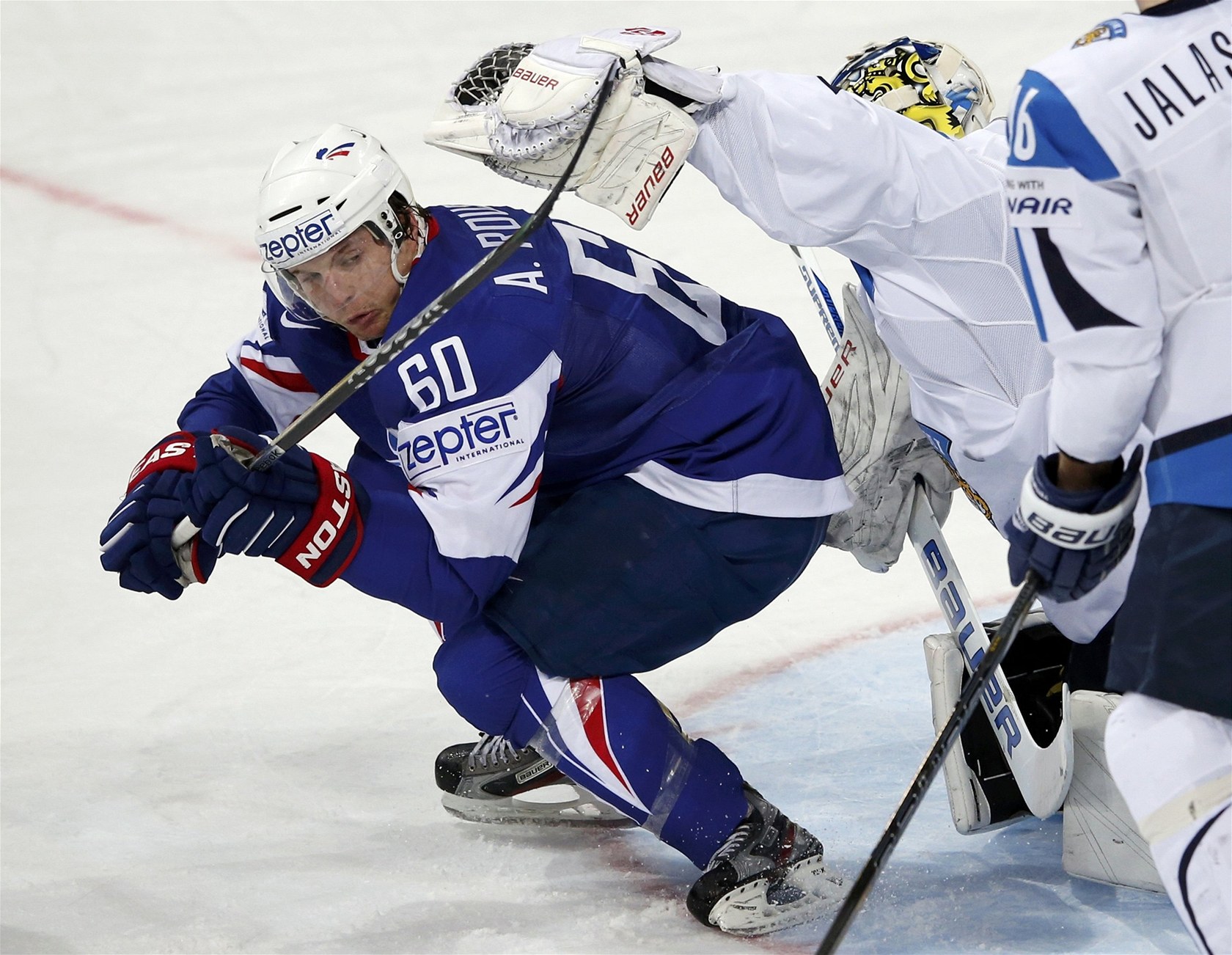 Slovenský útočník Jozef Stümpel padá po souboji s Patrickem Hagerem.