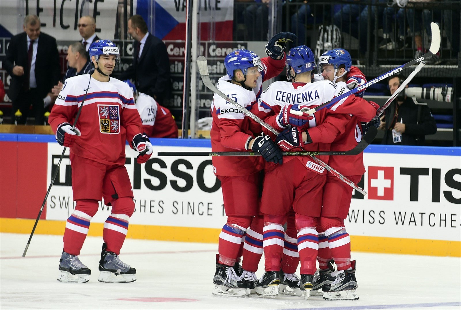 Čeští hokejisté se radují z prvního gólu proti Lotyšsku.