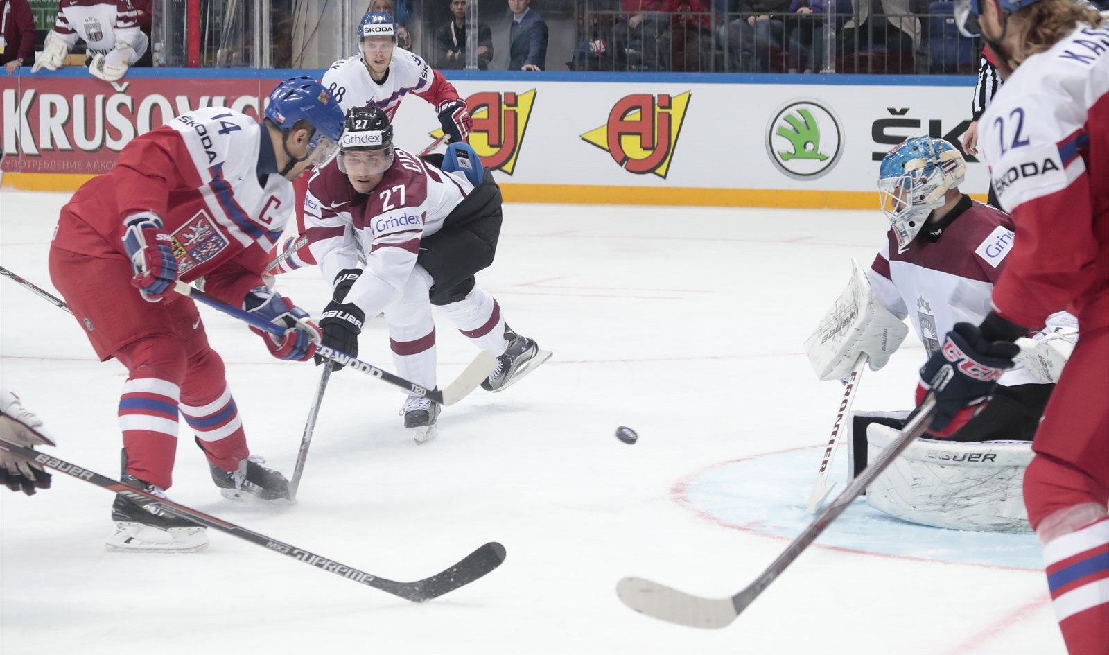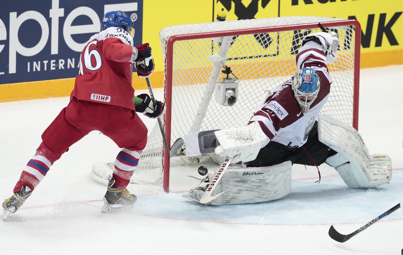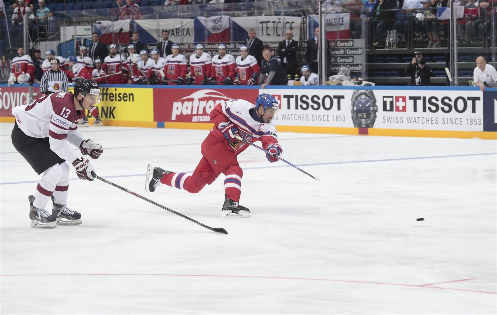 UŽ VÁM HO TAM POSÍLÁM. Český kapitán Tomáš Plekanec (vlevo) skóruje do lotyšské sítě.
