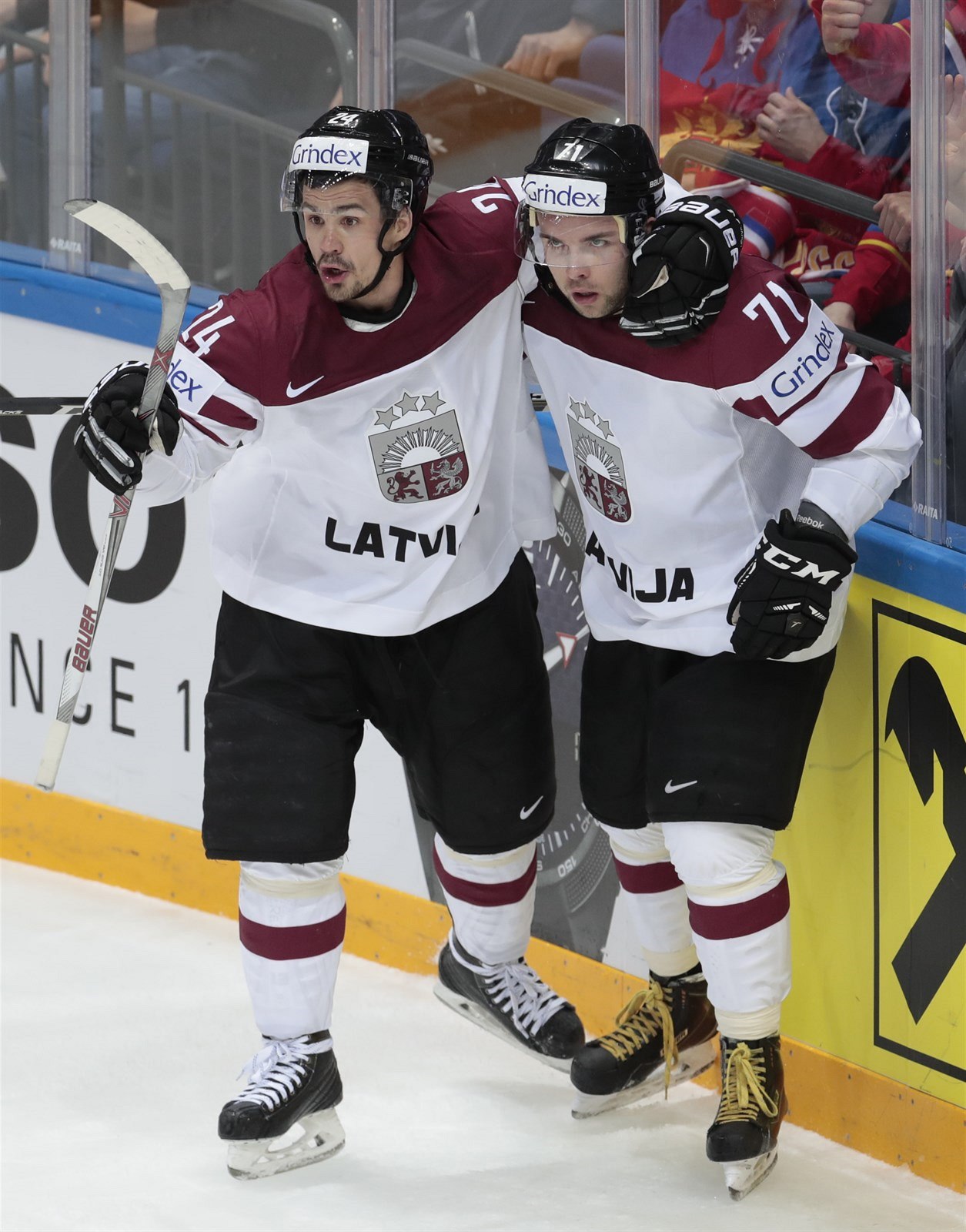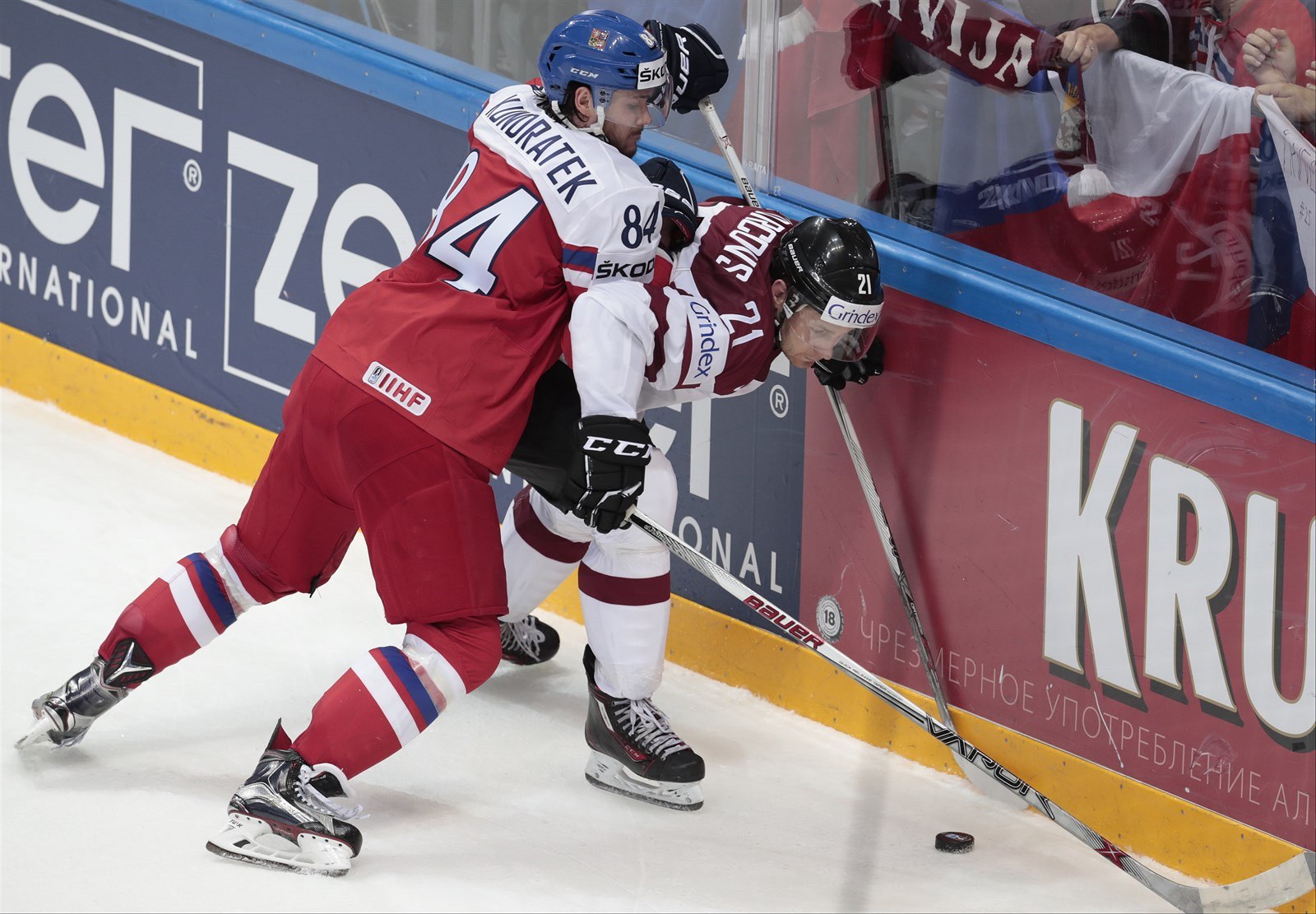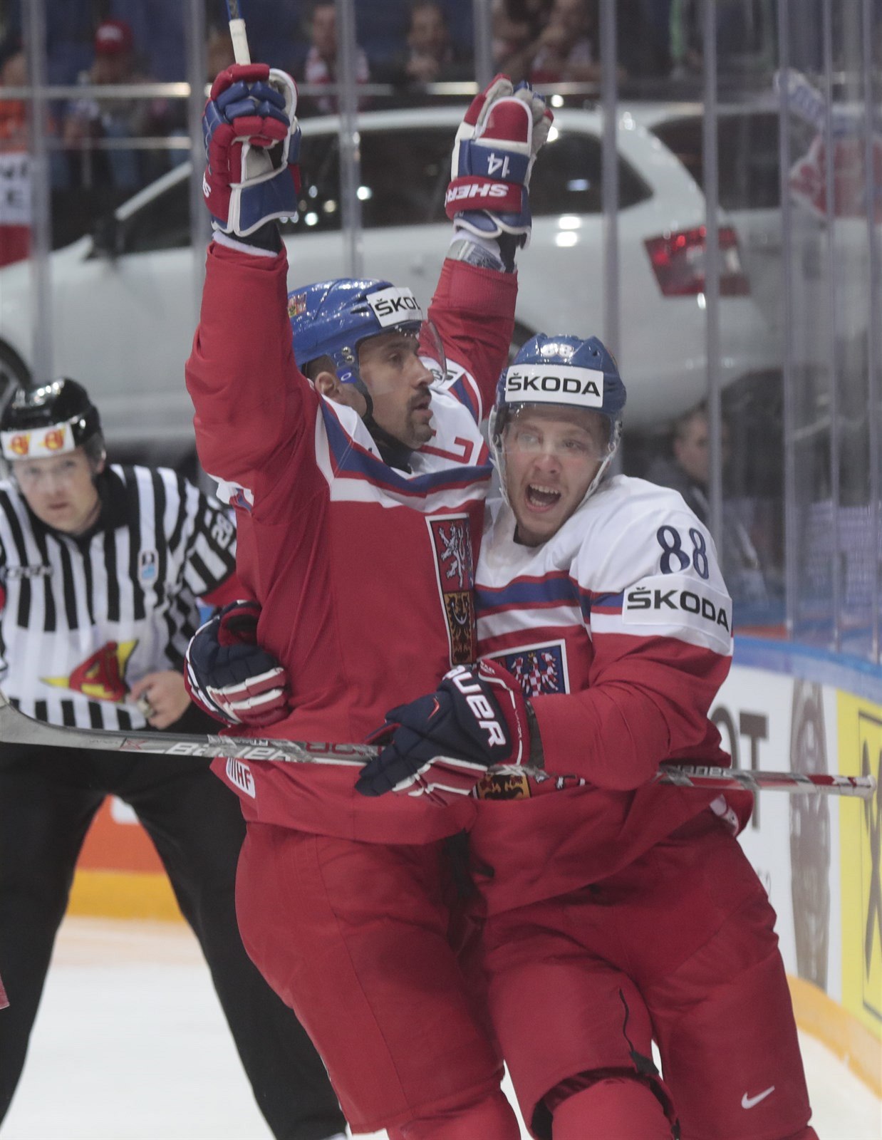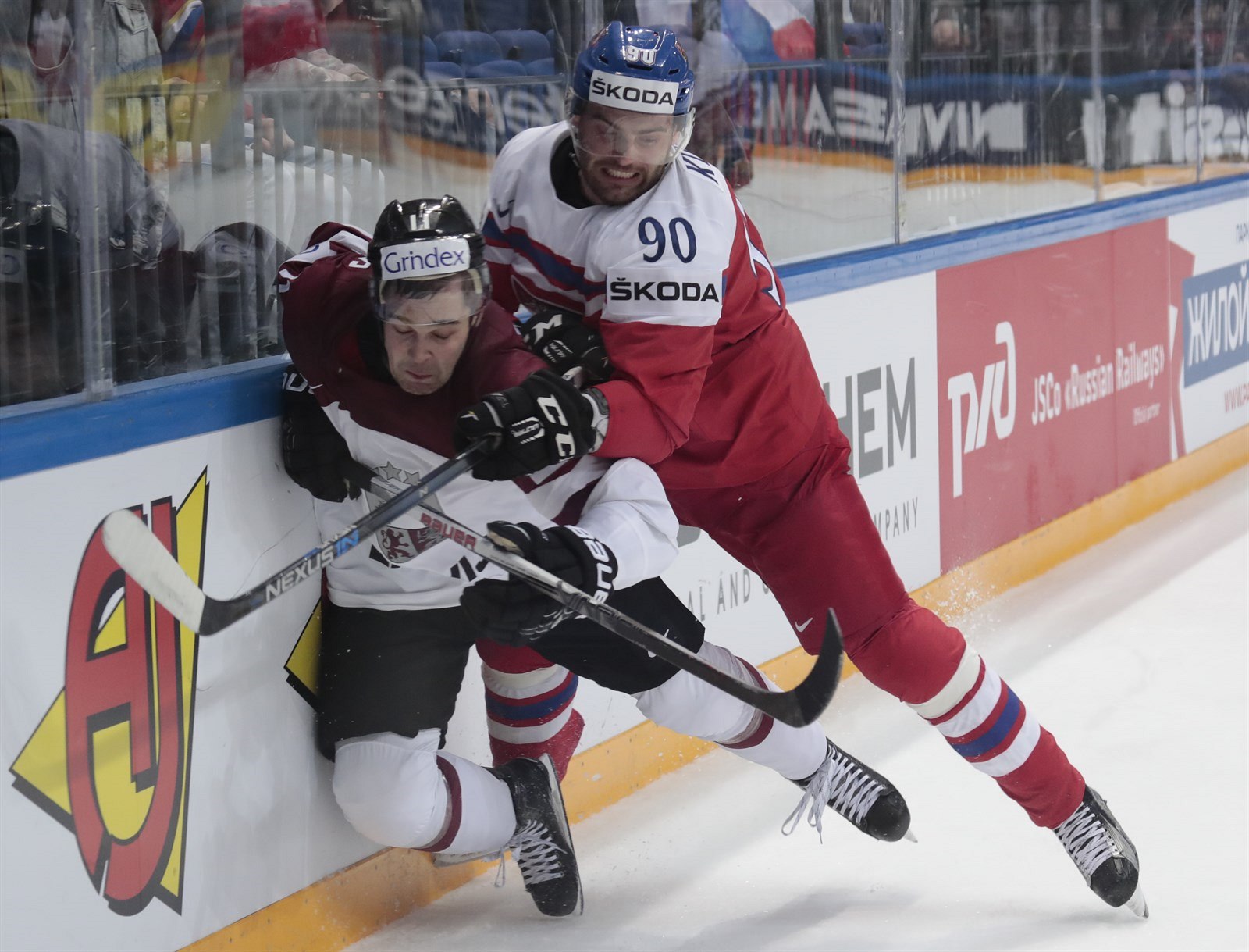 UŽ VÁM HO TAM POSÍLÁM. Český kapitán Tomáš Plekanec (vlevo) skóruje do lotyšské sítě.