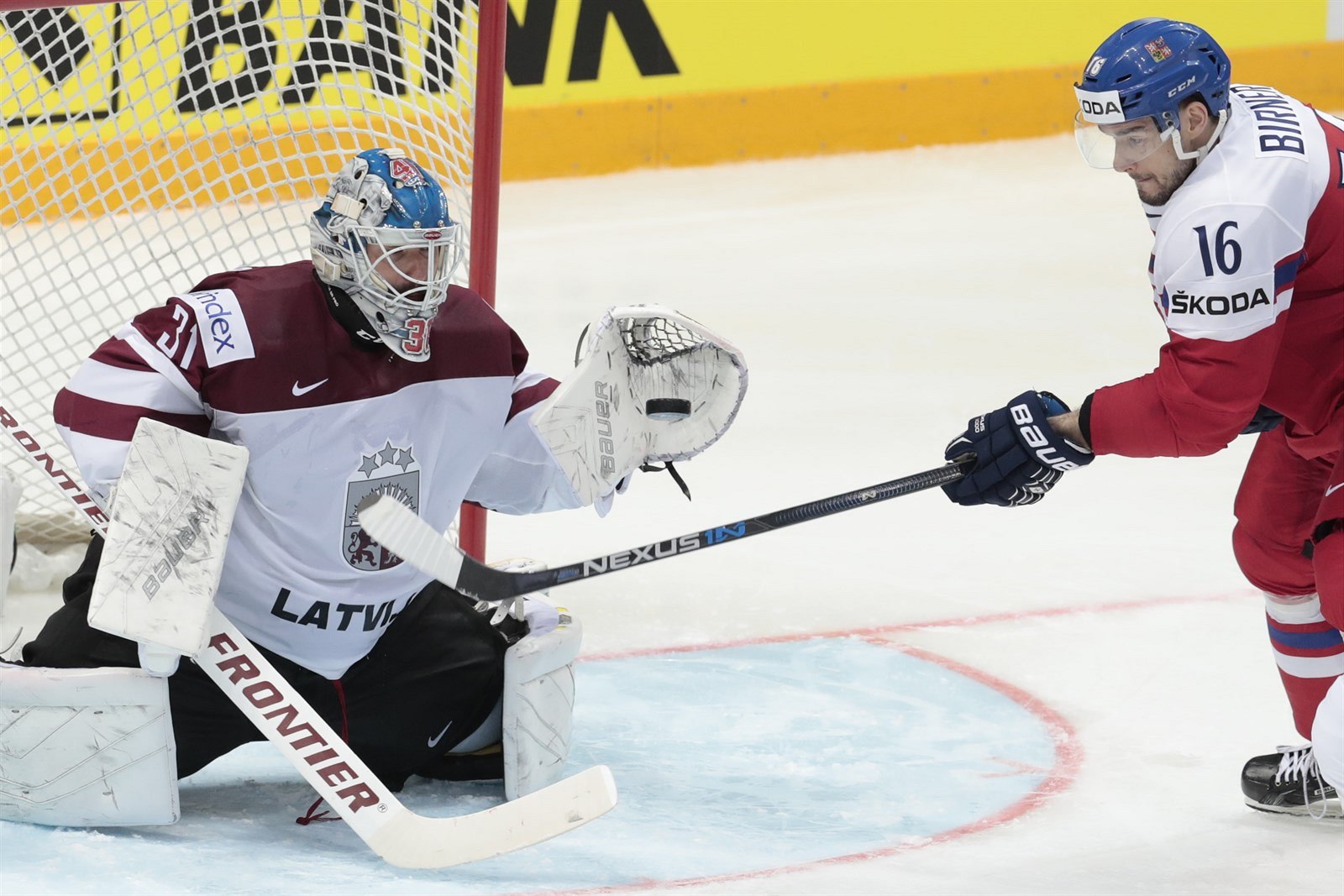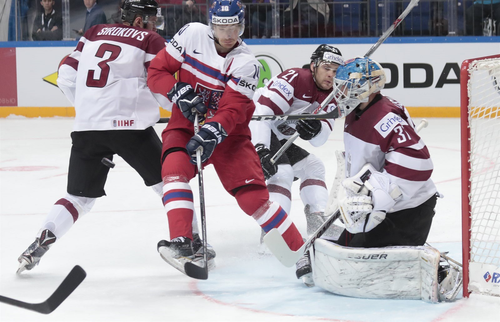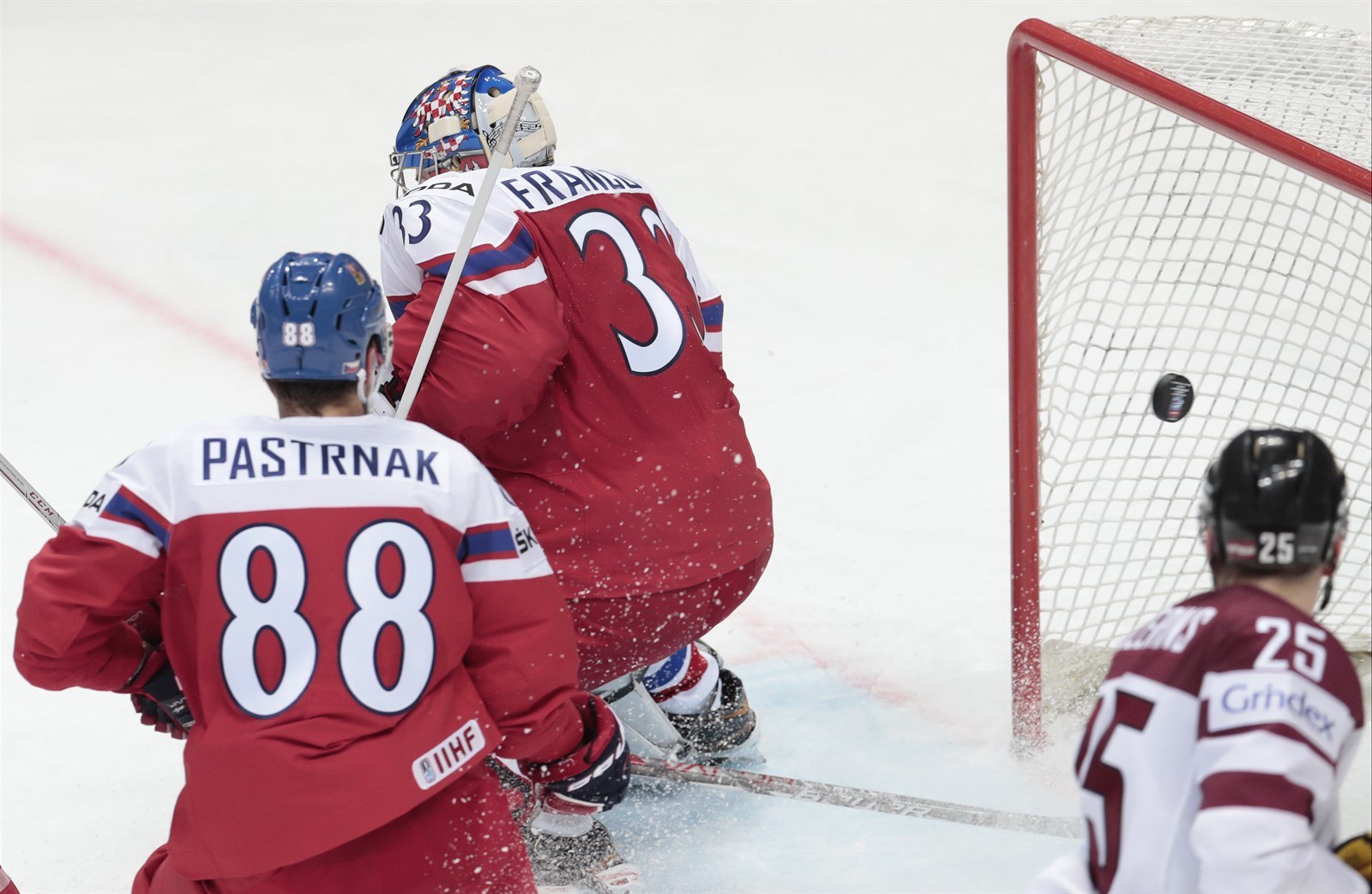 Český gólman Pavel Francouz inkasuje v utkání s Lotyšskem.