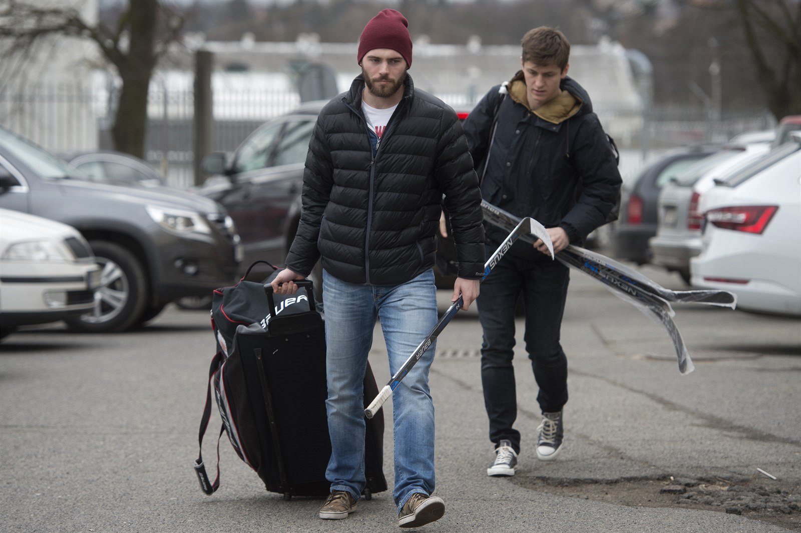 Útočníci Robert Kousal (vlevo) a Lukáš Radil přicházejí k zimnímu stadionu ve Velkých Popovicích.