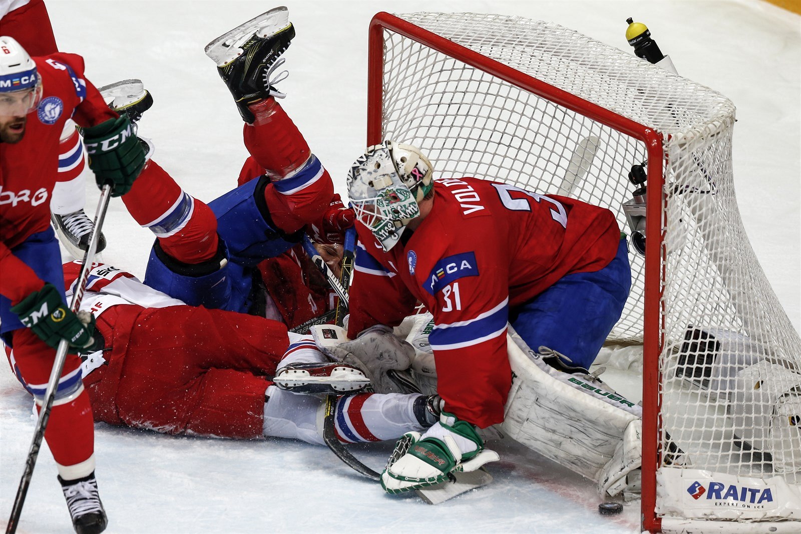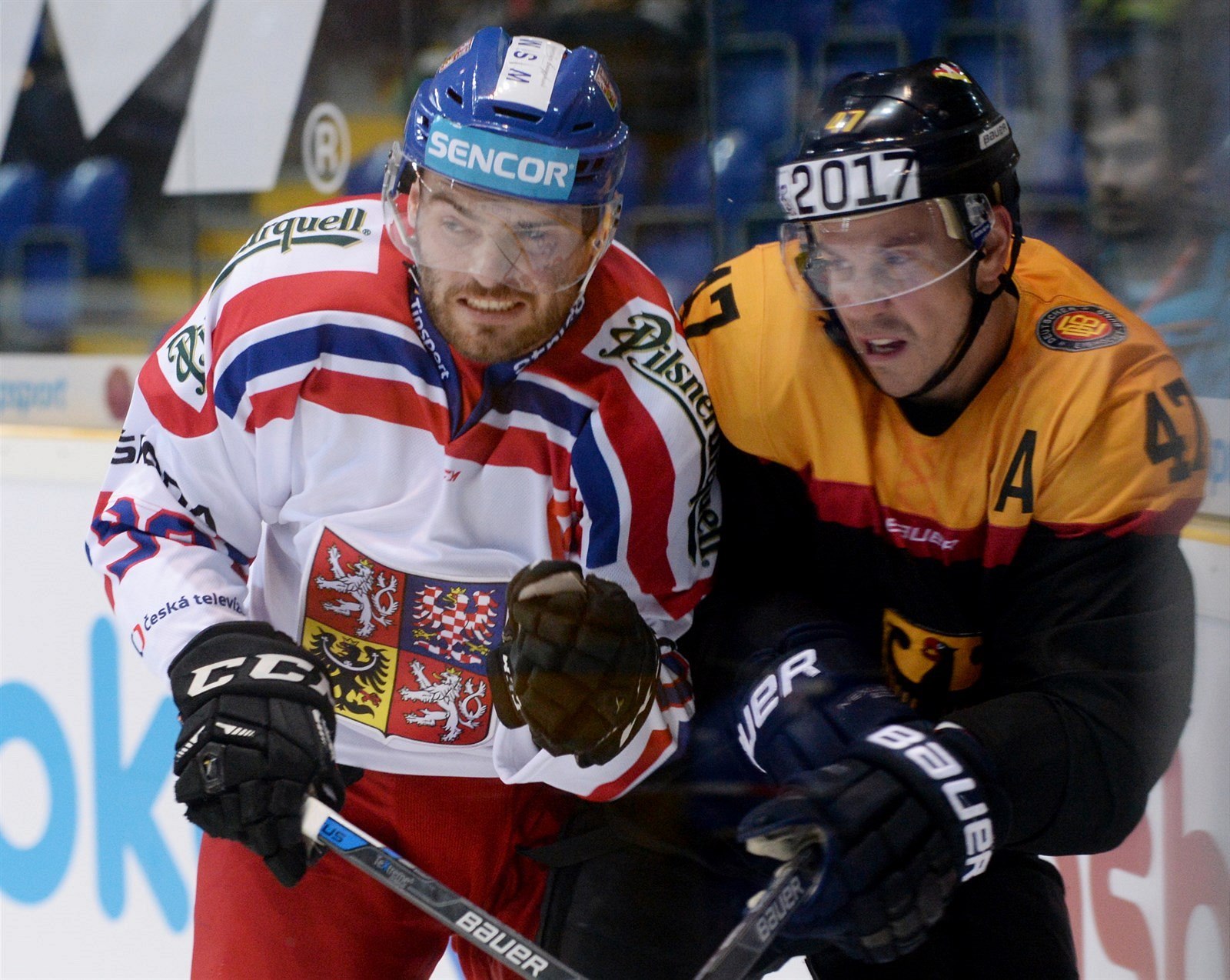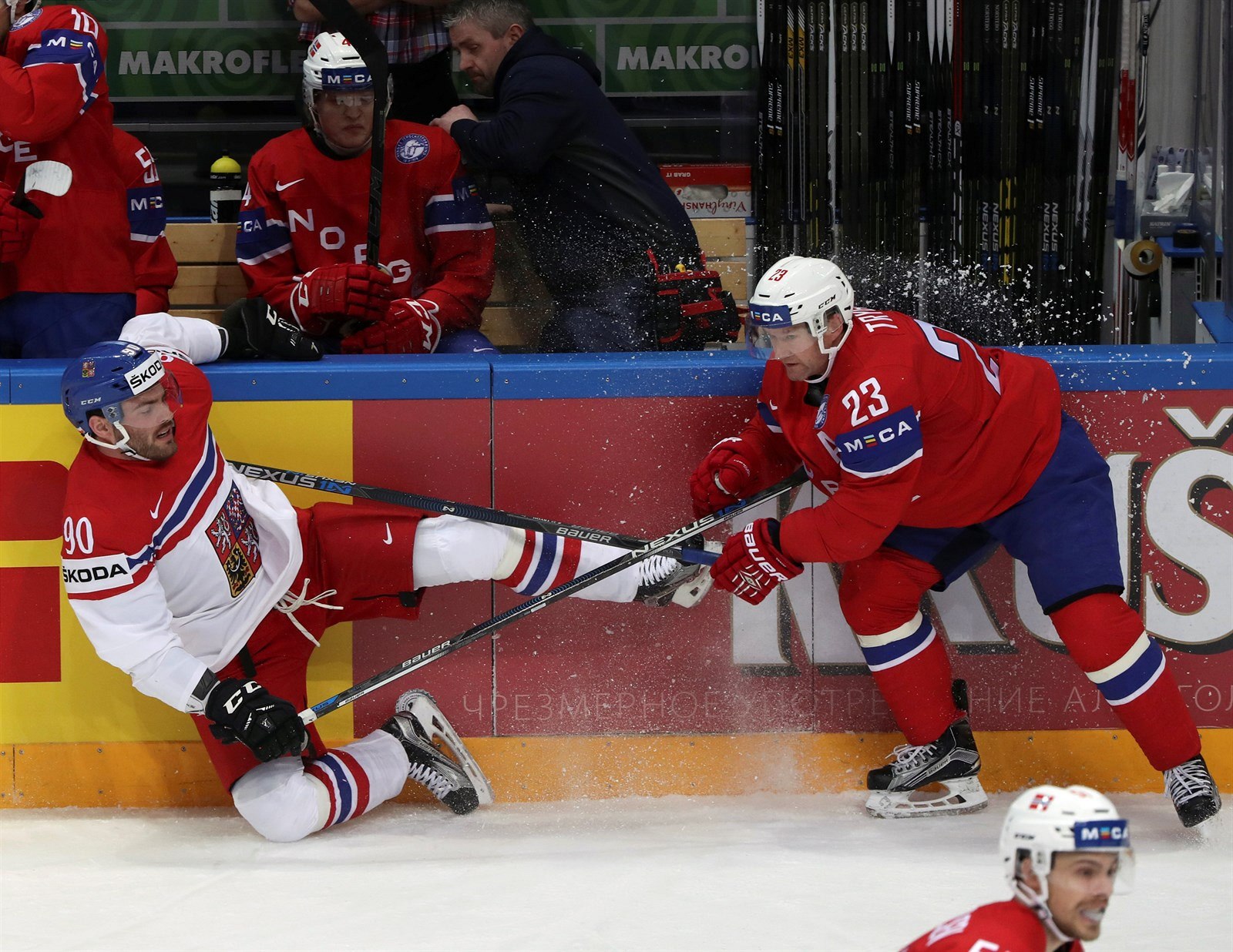Souboj u mantinelu, vlevo je lotyšský hokejista Kristaps Sotnieks, vpravo pak Robert Kousal.