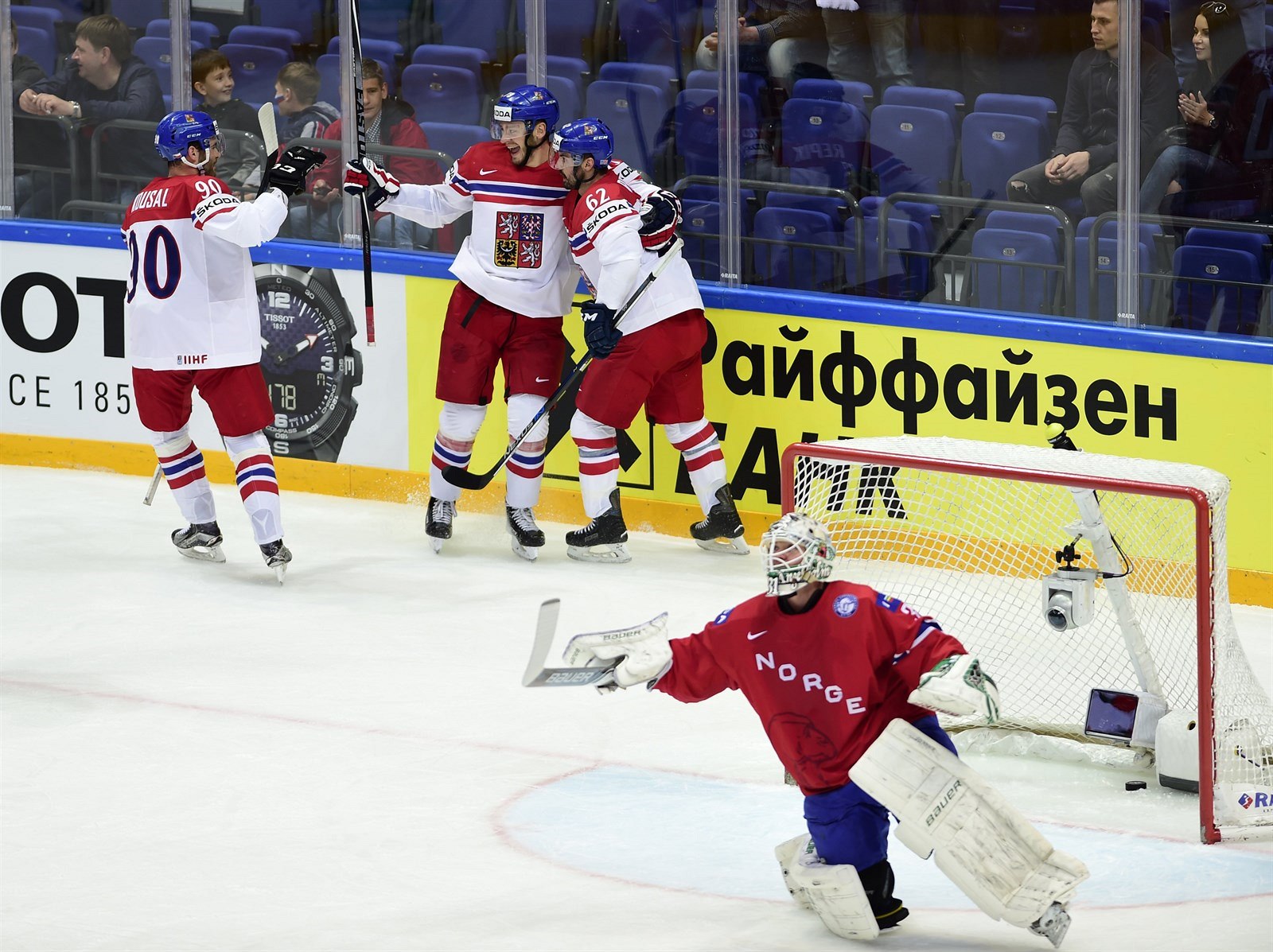 Tomáš Zohorna (uprostřed) slaví s Robertem Kousalem a Michalem Řepíkem gól v norské síti