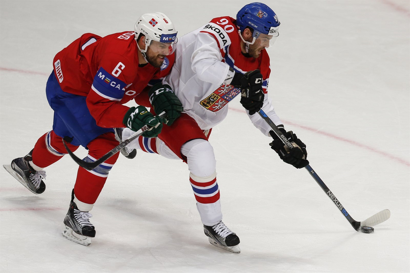 Český hokejista Robert Kousal (vpravo) ujíždí Jonasi Holösovi z Norska.