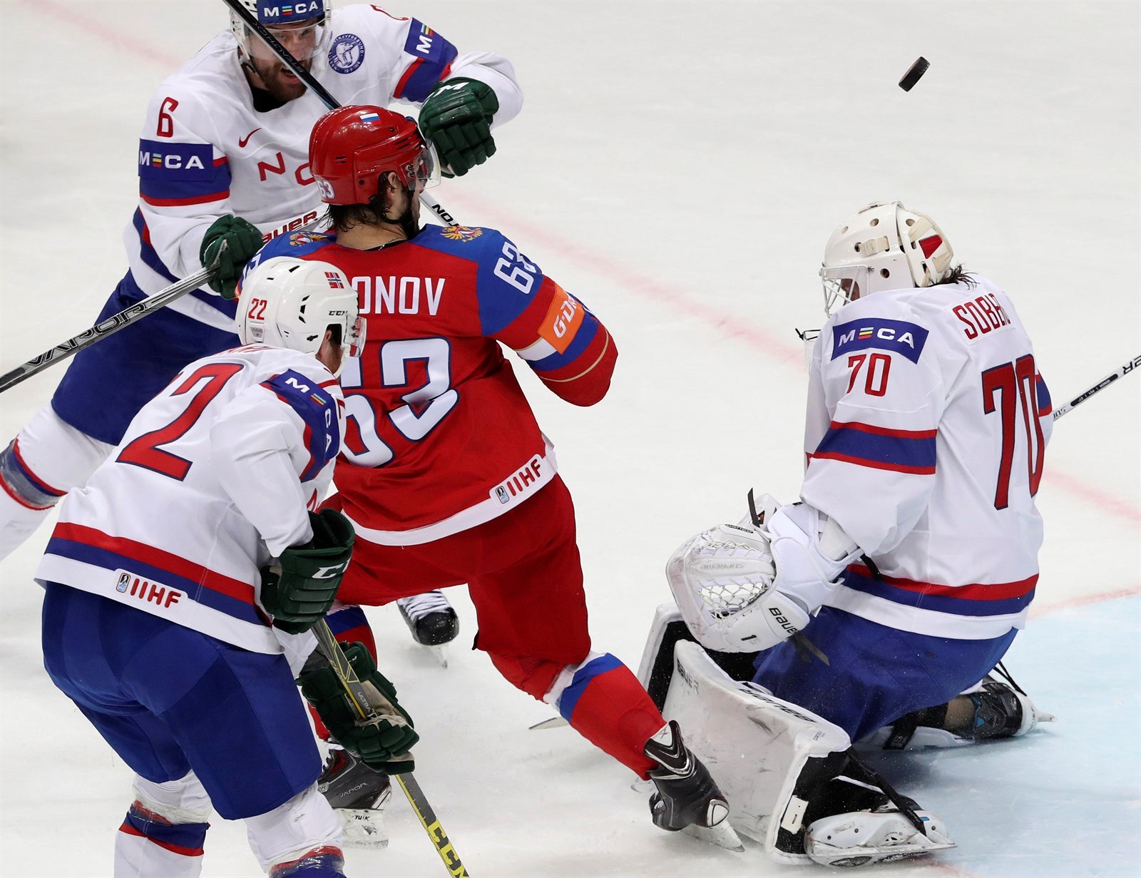Útočnou snahu ruské hvězdy Alexandra Ovečkina sleduje Kristian Forsberg z Norska.