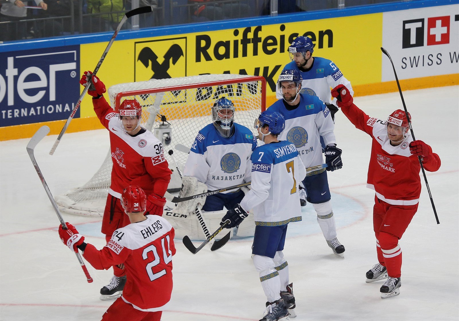 Dánští hokejisté slaví gól v utkání proti Kazachstánu.