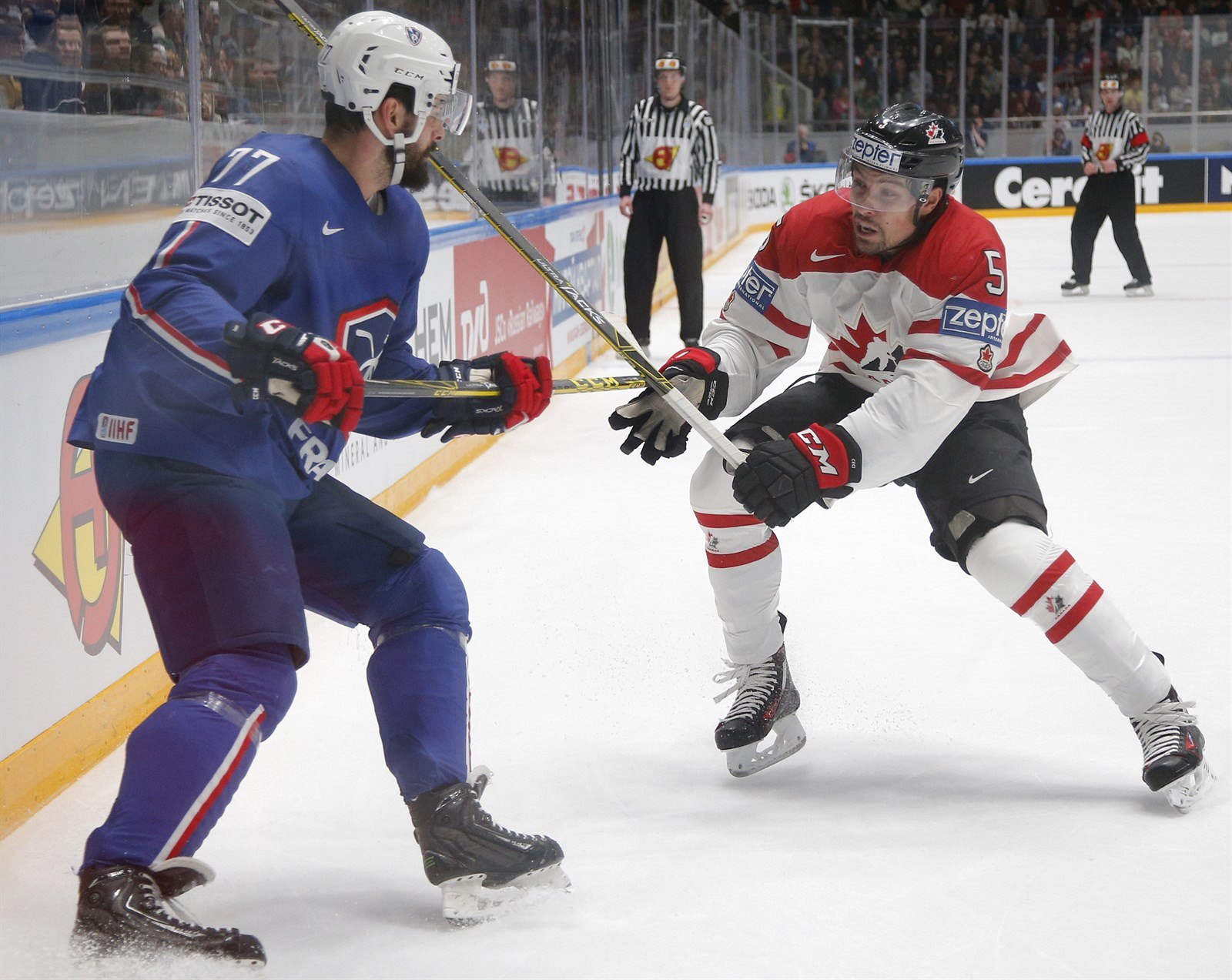 Kanadský obránce Cody Ceci (vpravo) v souboji s francouzským útočníkem Yorickem Treillem.