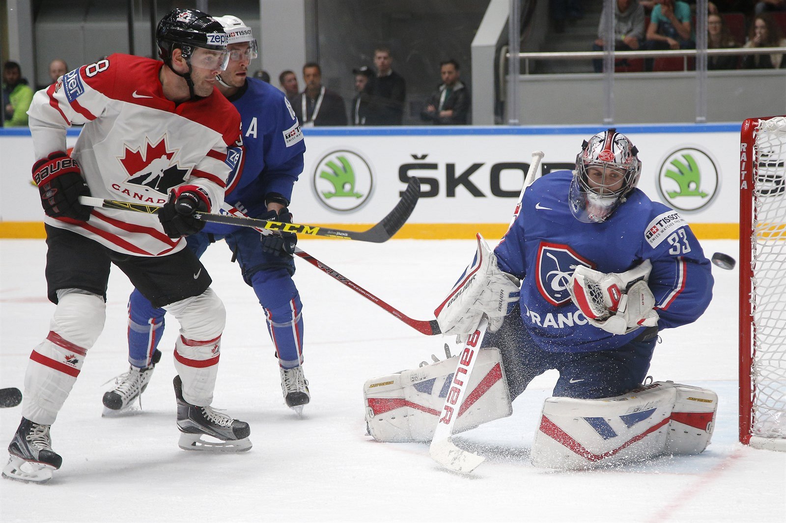 V ŠANCI. Kanadský útočník Boone Jenner před francouzským brankářem Ronanem Quemenerem.