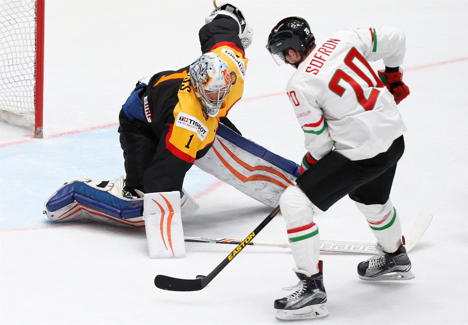 Maďarský útočník Istvan Sofron překonává Thomase Greisse v brance Německa.