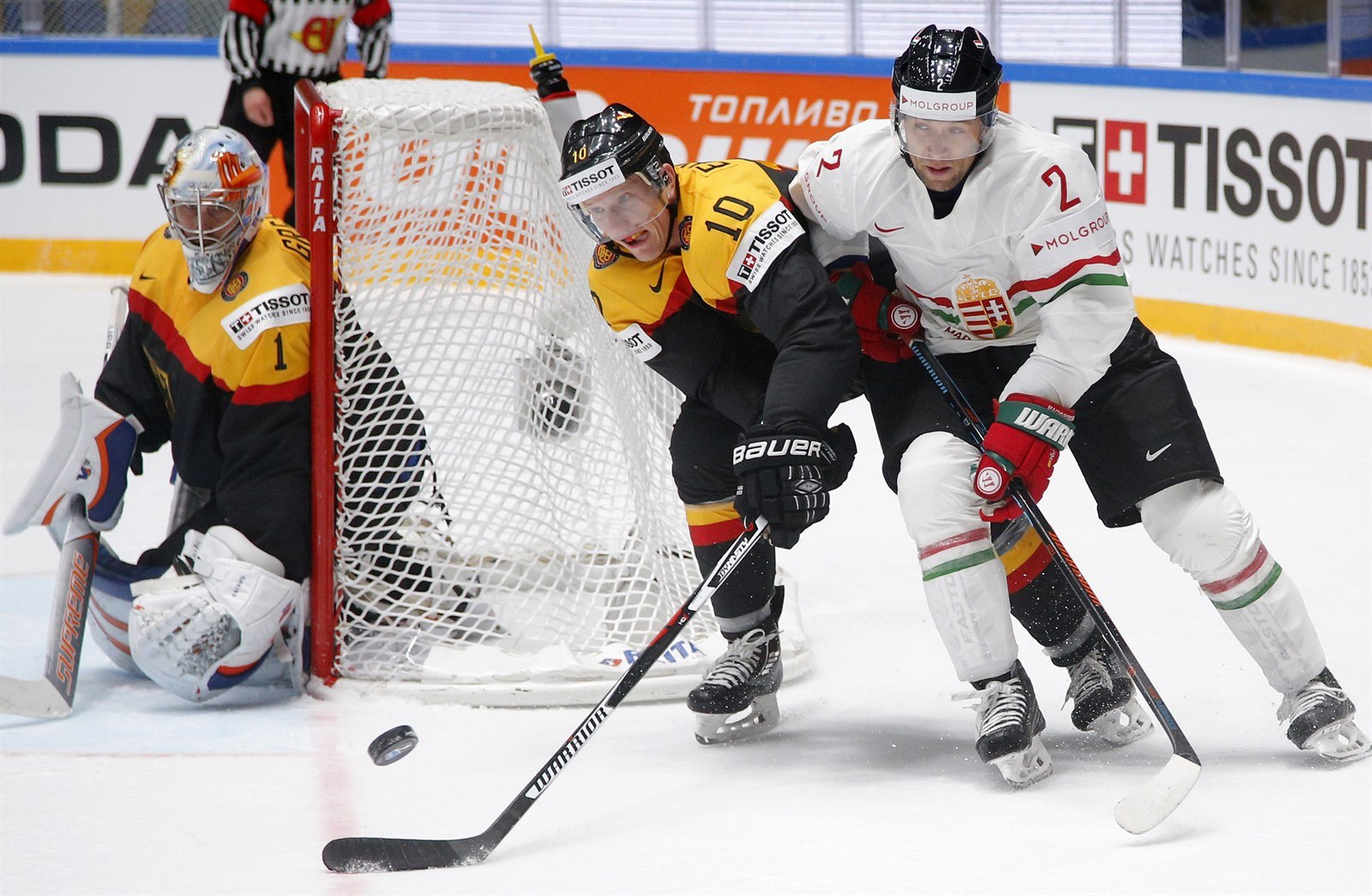 Němec Christian Ehrhoff v souboji o puk s Csabou Kovacsem z Maďarska.
