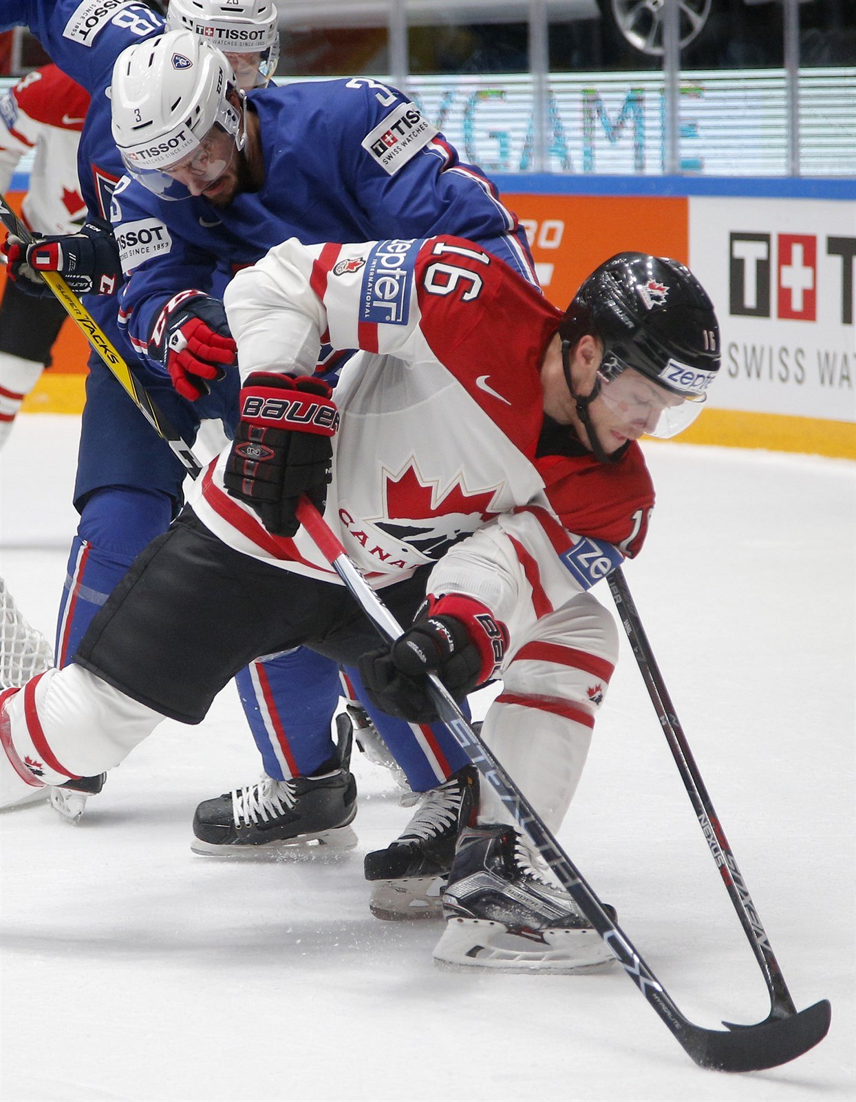 Kanadský hokejista Max Domi si kryje puk před Francouzem Jonathanem Janilem.
