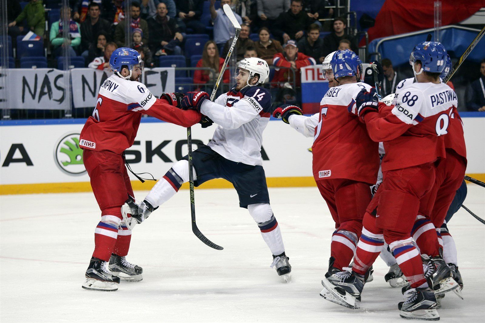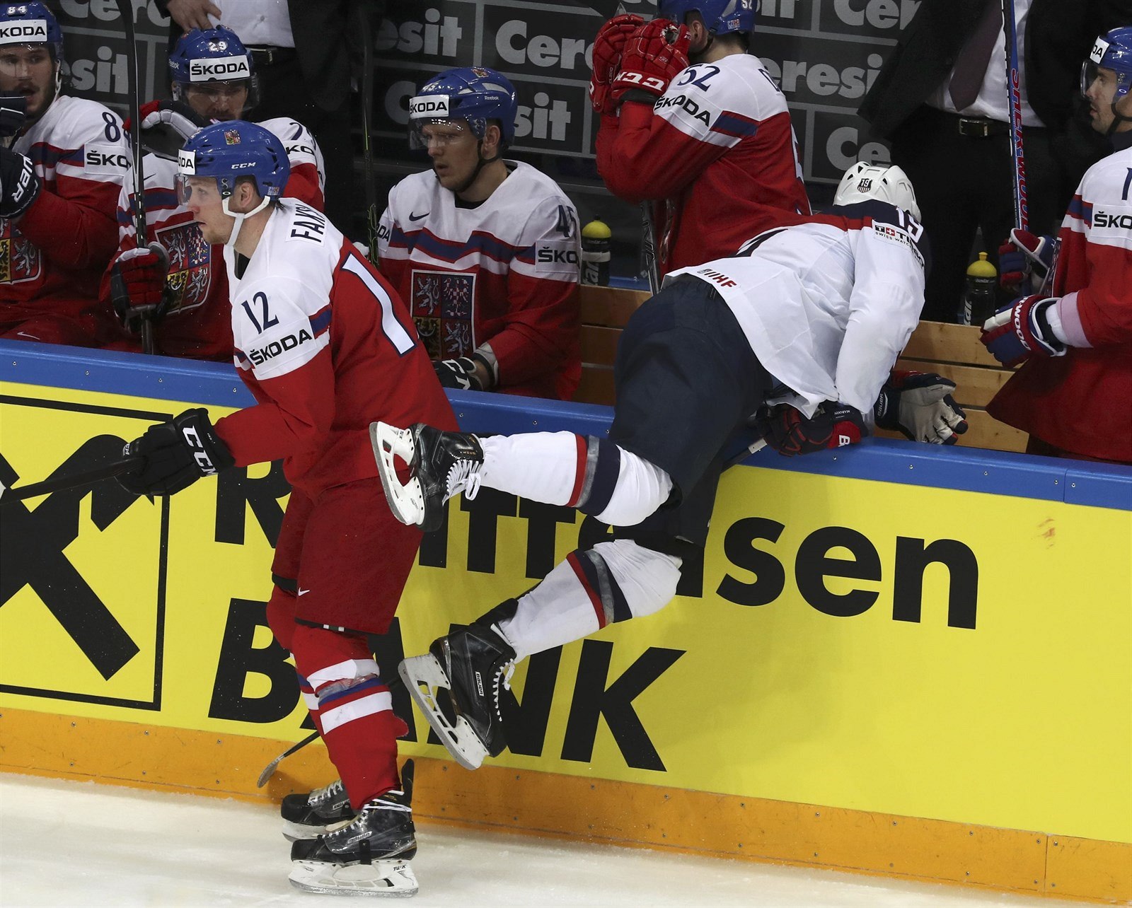 Radek Faksa krátce po souboji s americkým protihráčem ve čtvrtfinále MS 2016
