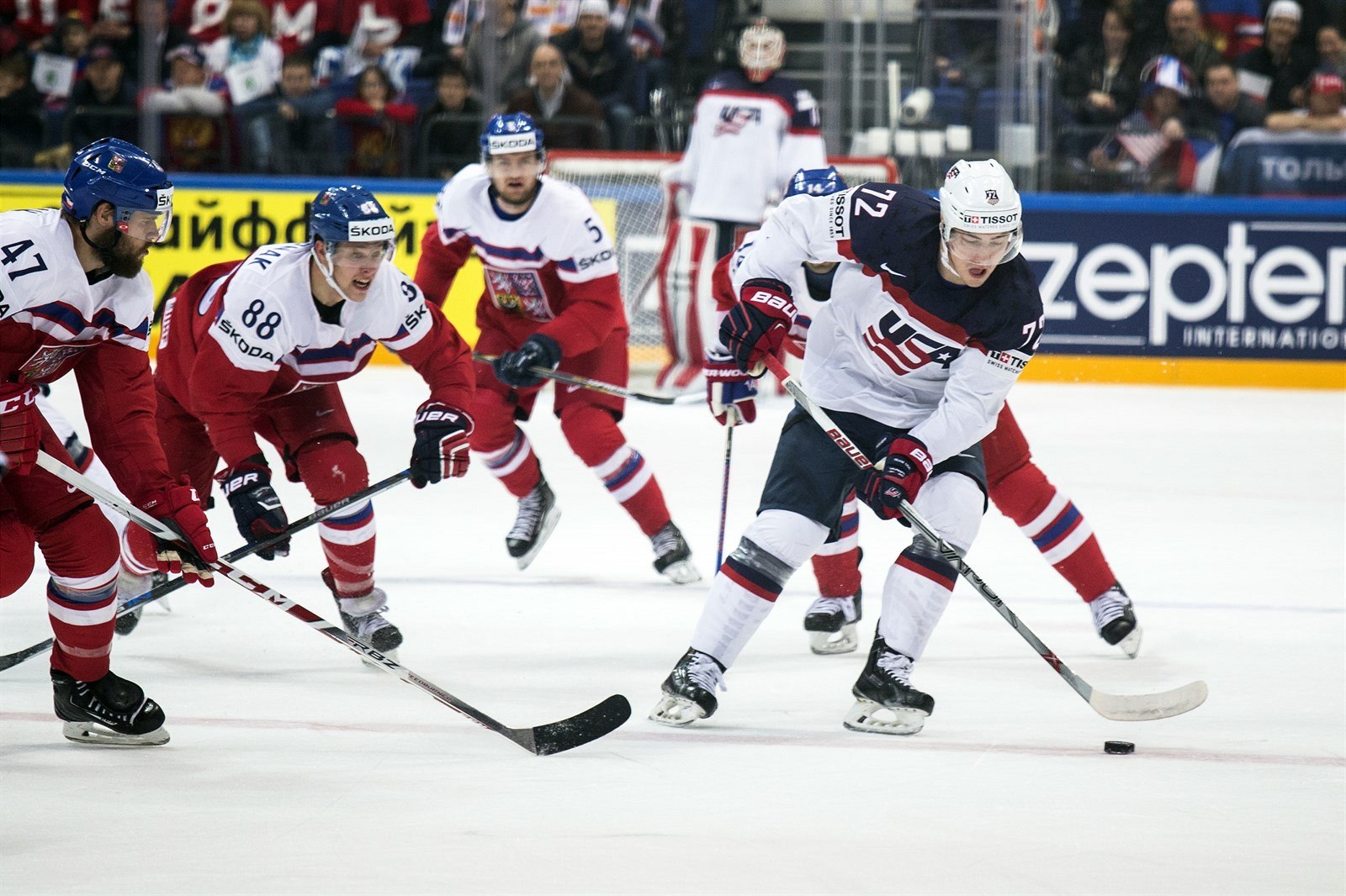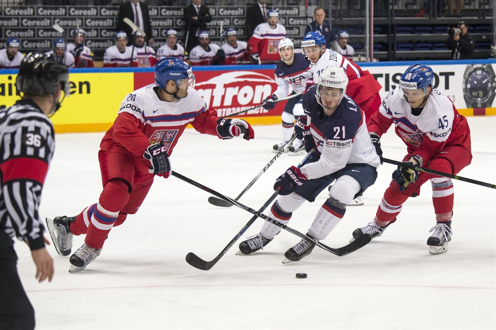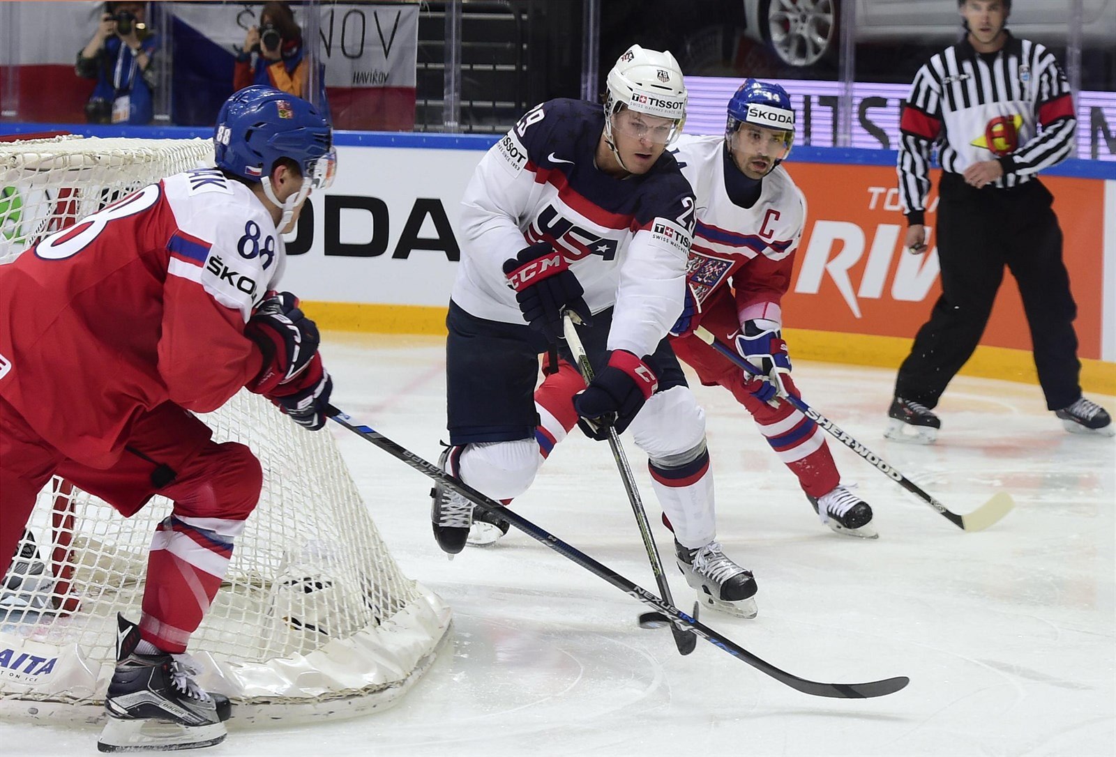 Americký reprezentant Jake McCabe se snaží vymanit z tlaku Davida Pastrňáka (vlevo) a Tomáše Plekance (vpravo)