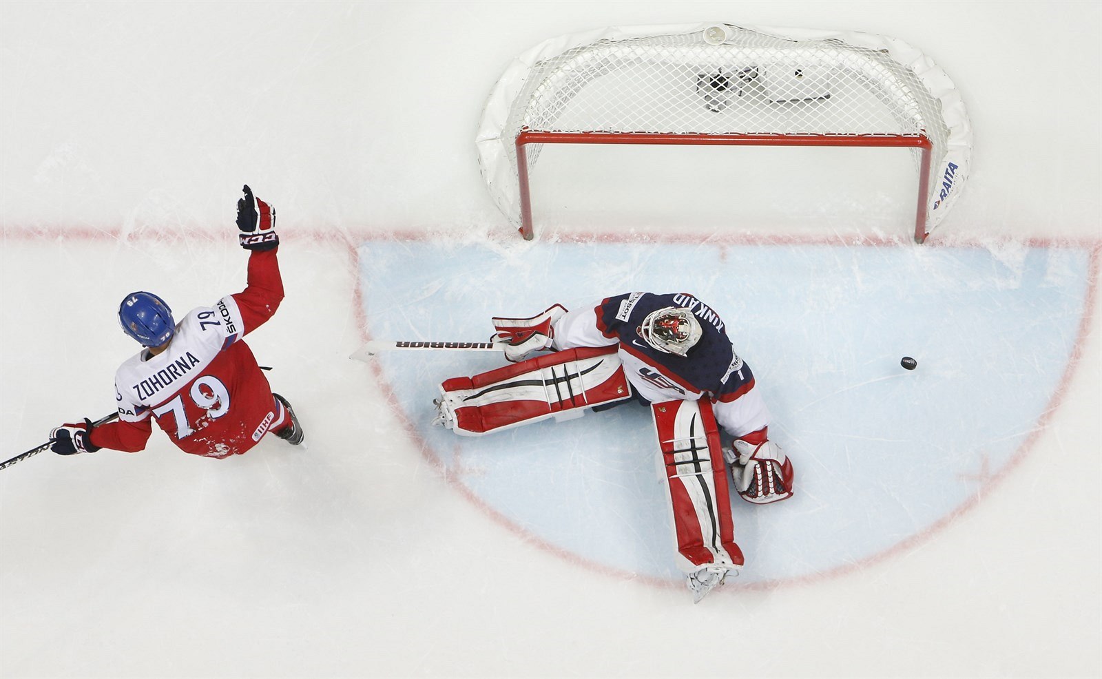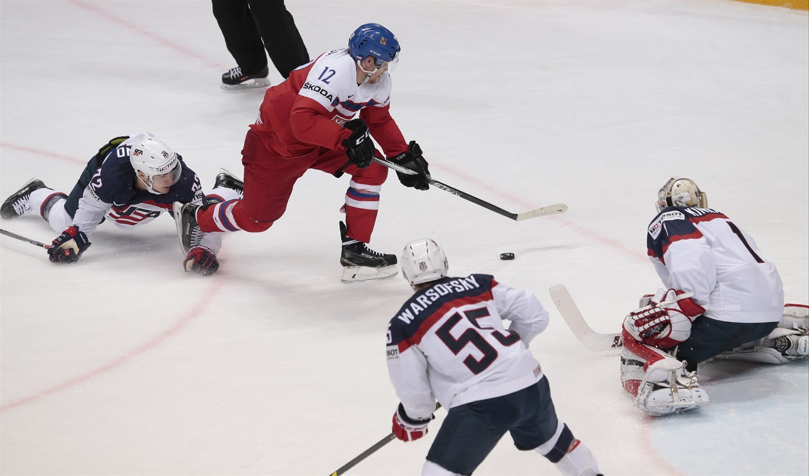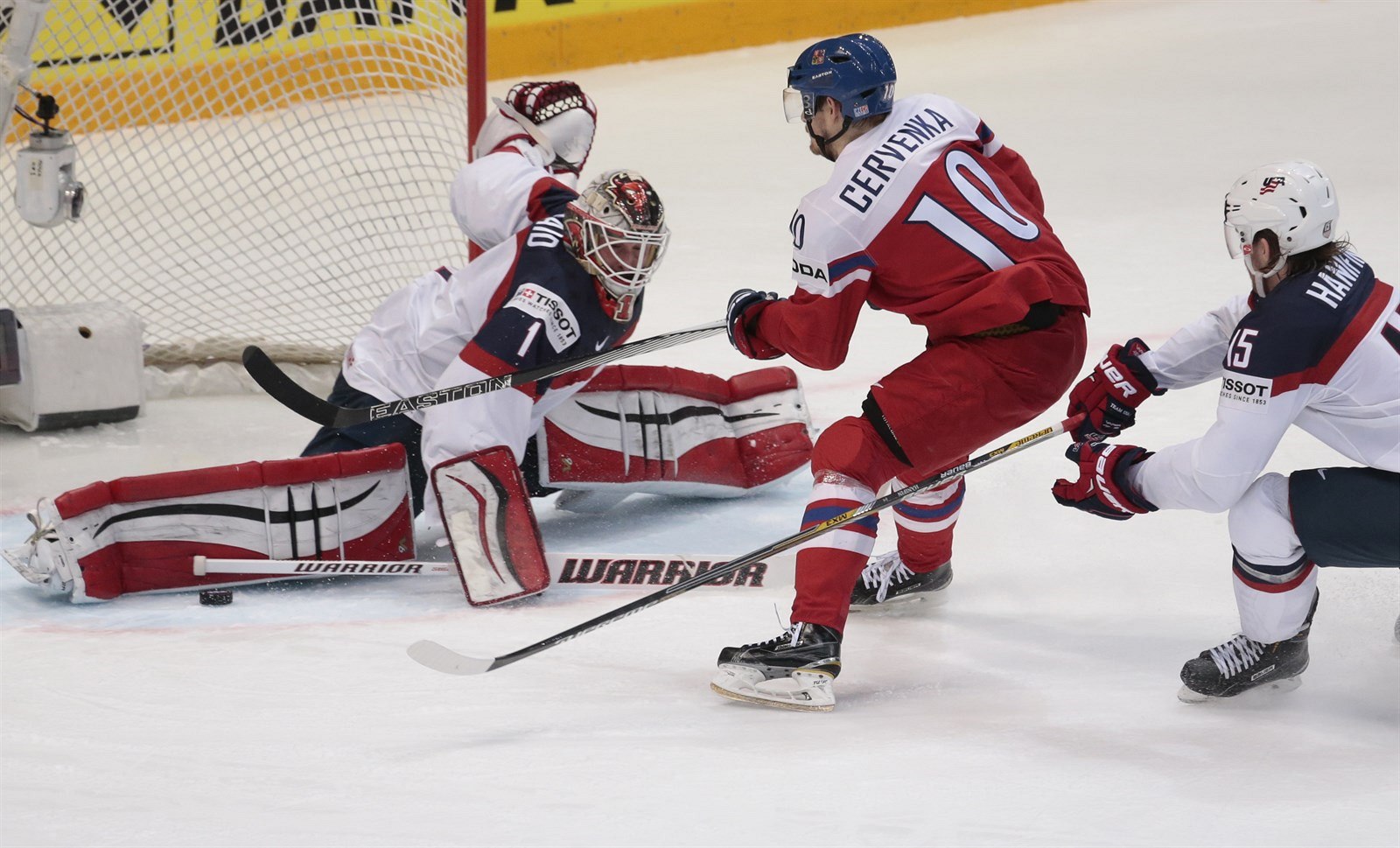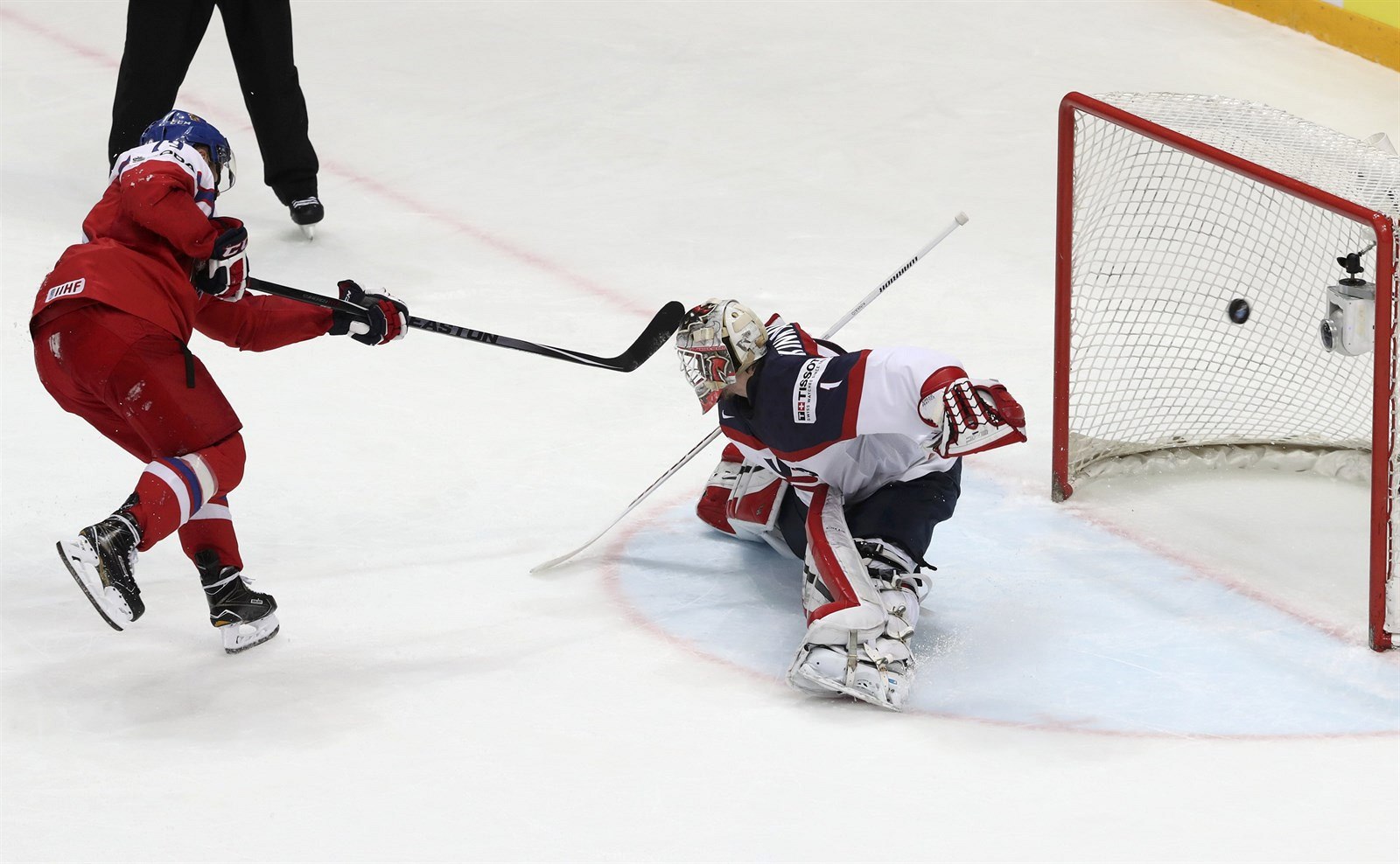 Roman Červenka v šanci řped americkým brankářem Keithem Kinkaidem.