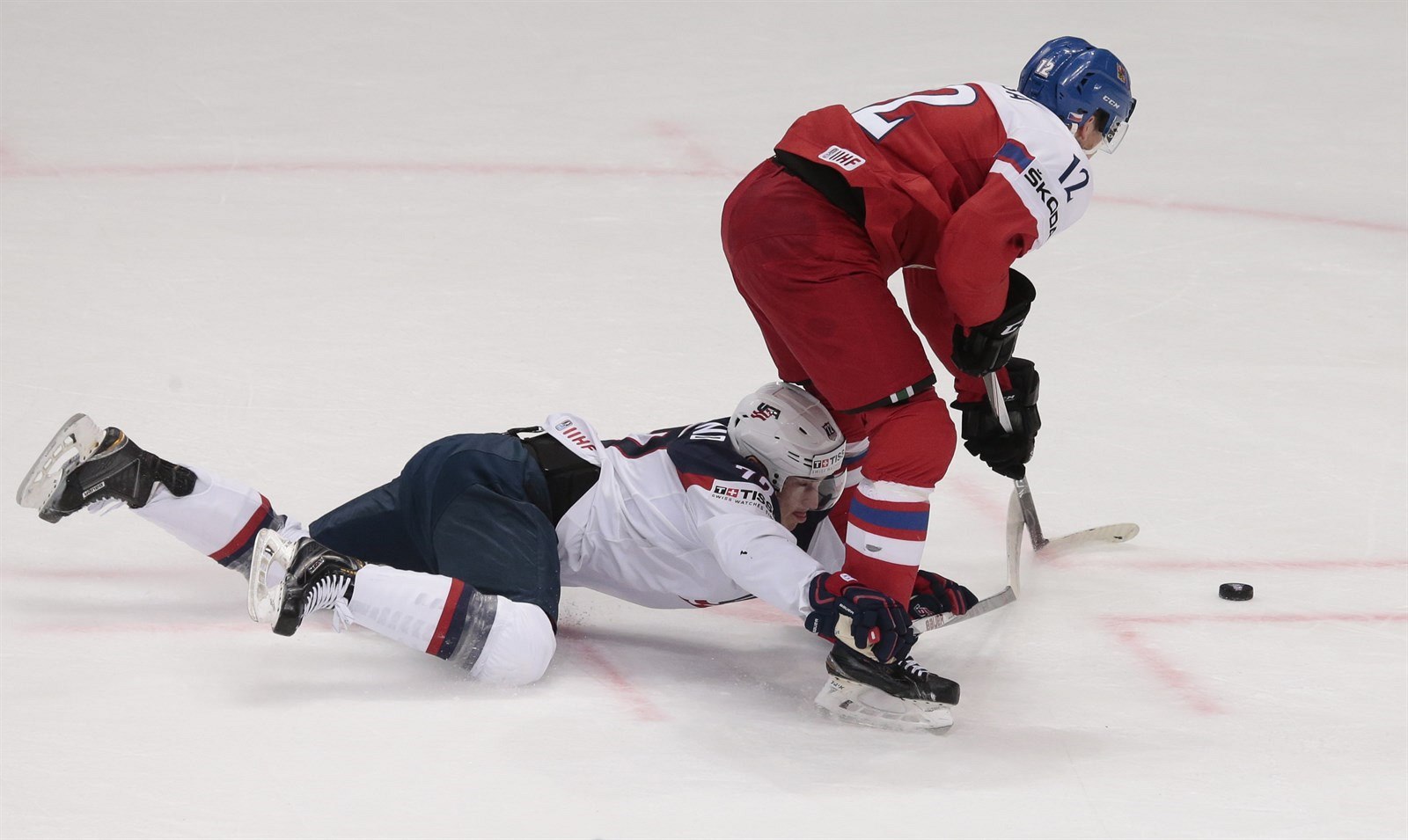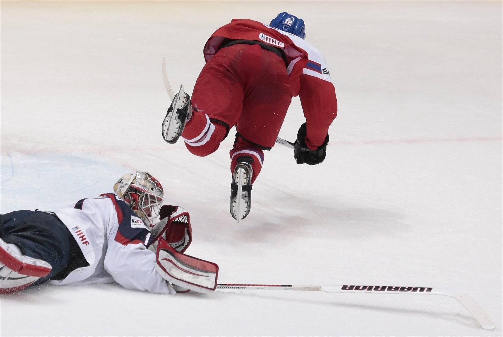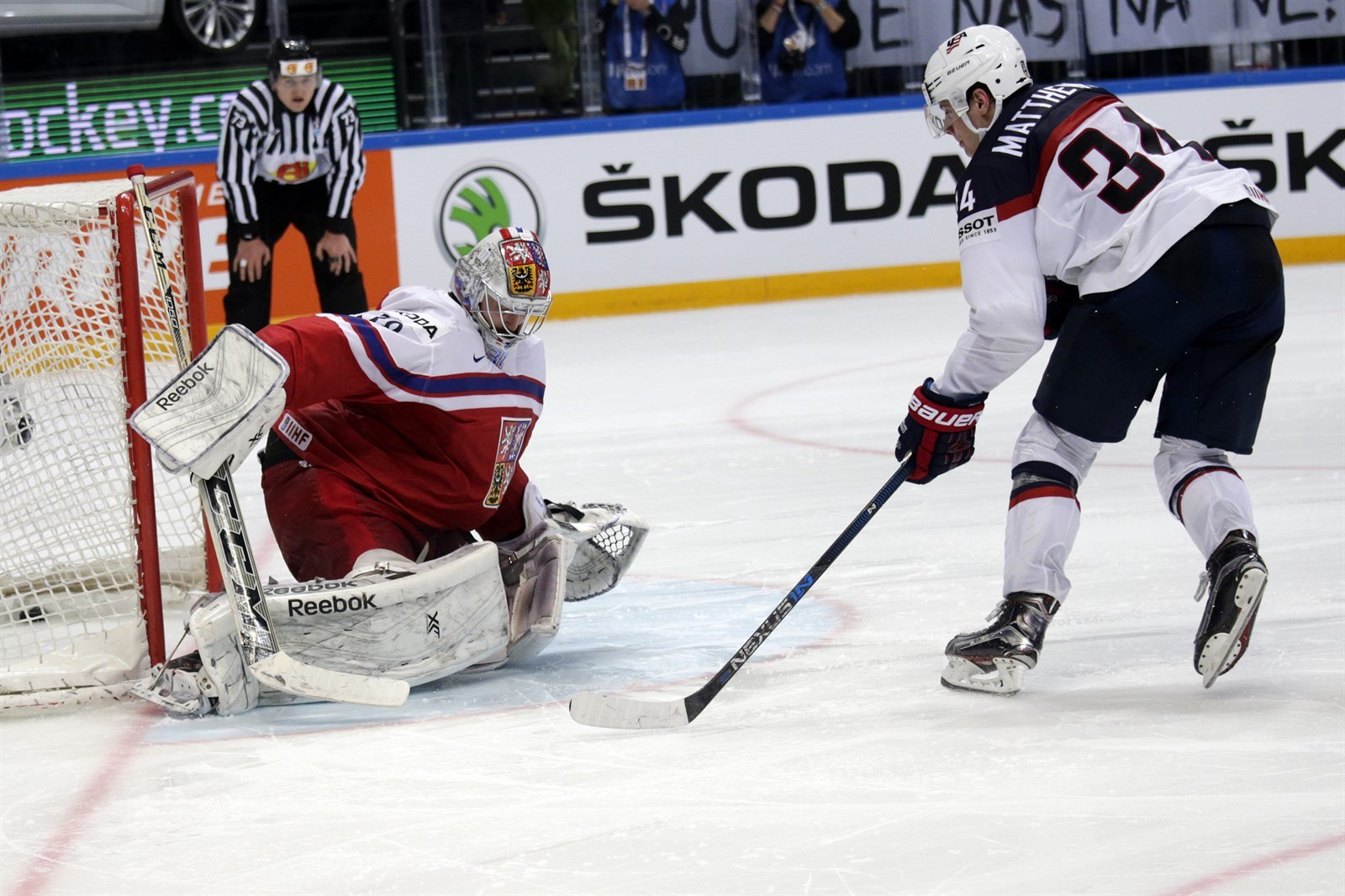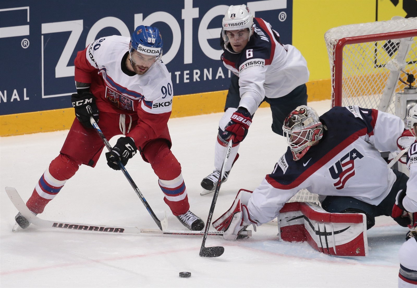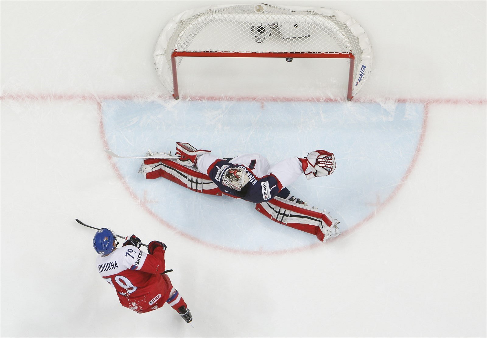 Roman Červenka v šanci řped americkým brankářem Keithem Kinkaidem.