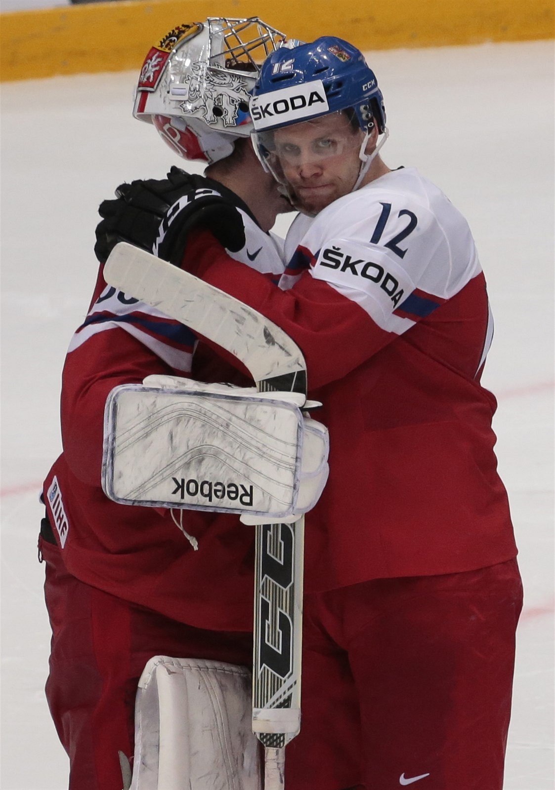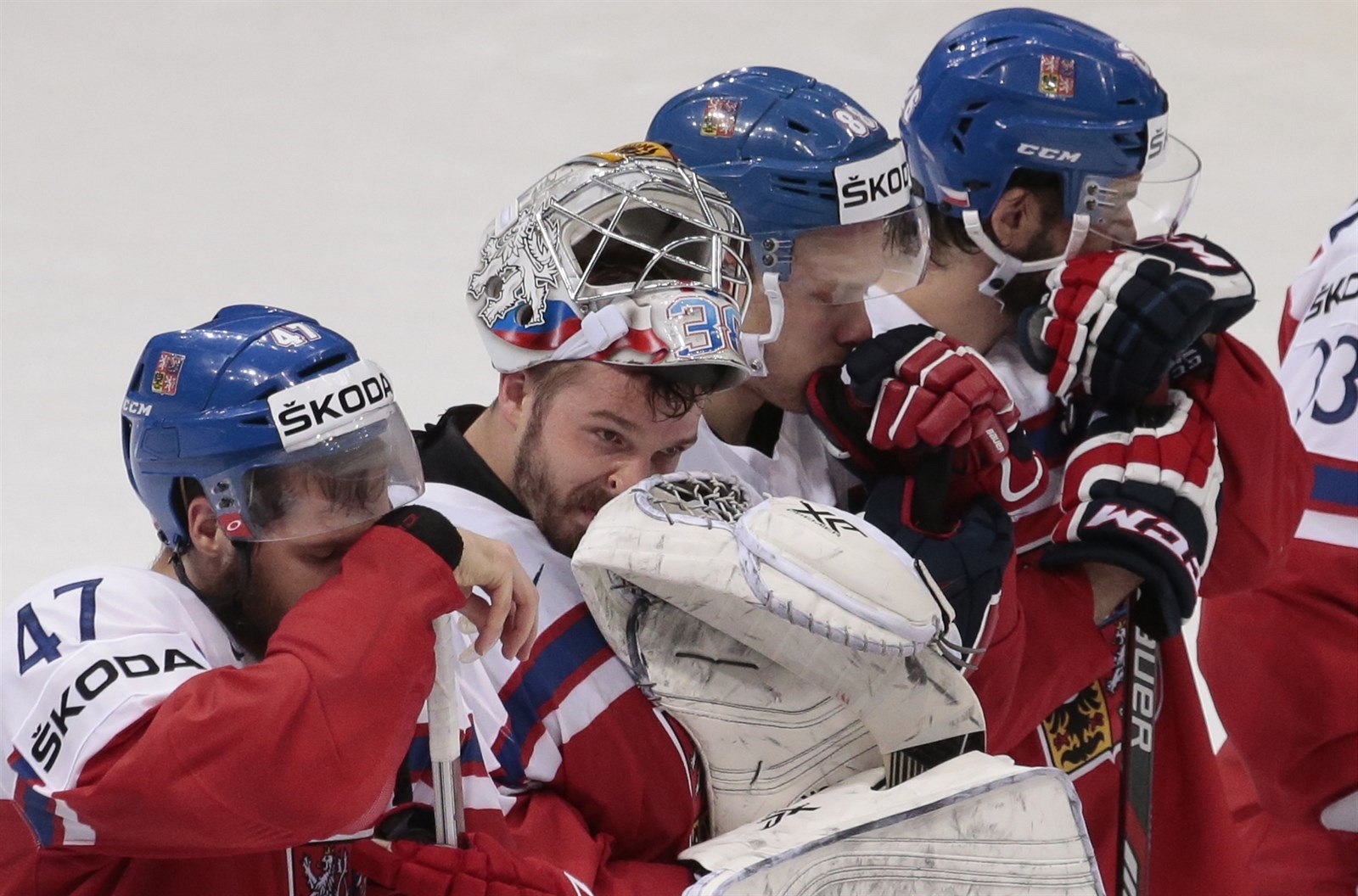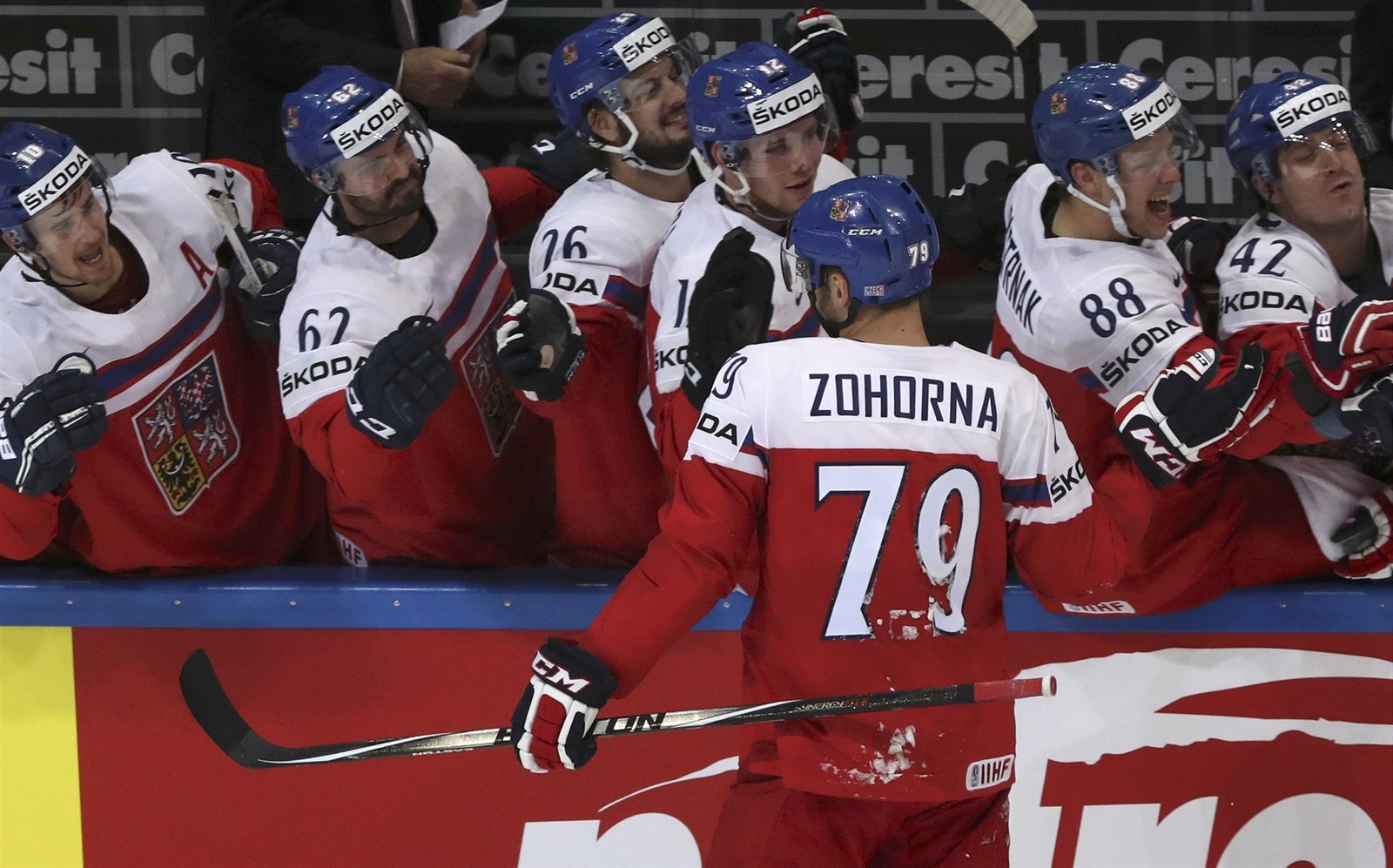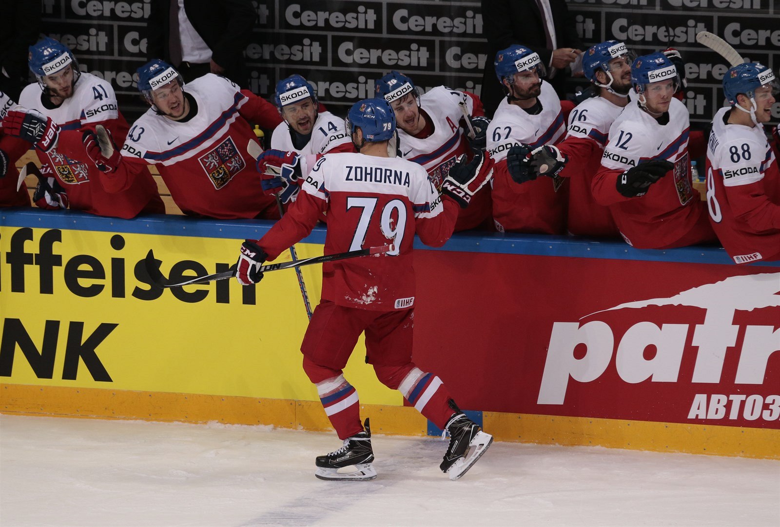 Tomáš Zohorna přijímá gratulace za proměněnou penaltu ve čtvrtfinále MS 2016 proti USA