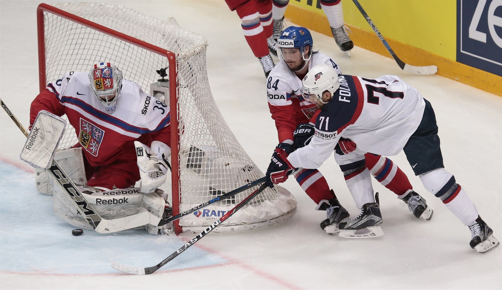 Český brankář Dominik Furch zasahuje, ještě se před něj tlačí Nick Foligno, kterého zpracovává obránce Tomáš Kundrátek.