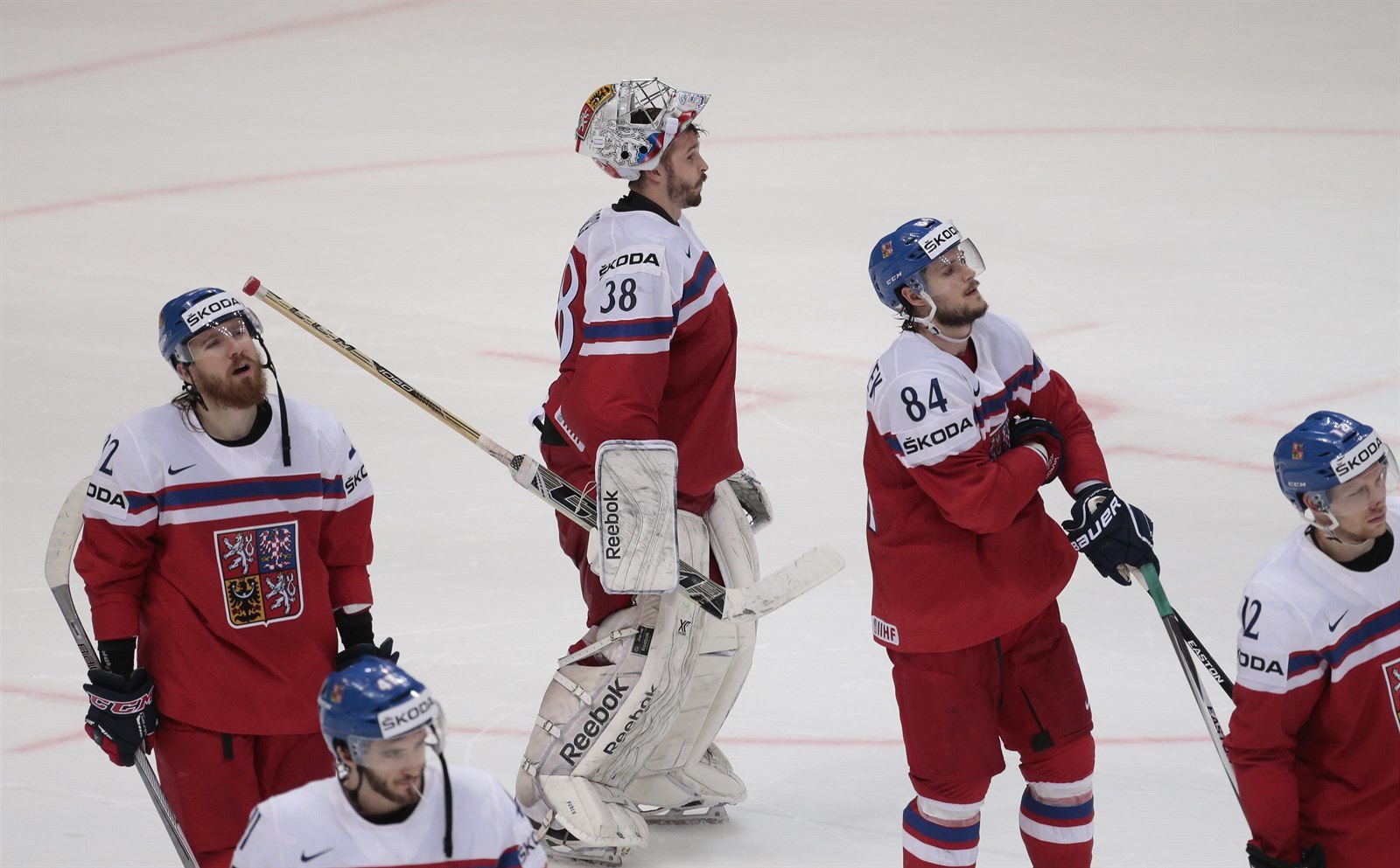 Frustrovaní čeští hokejisté po porážce s Američany ve čtvrtfinále MS.