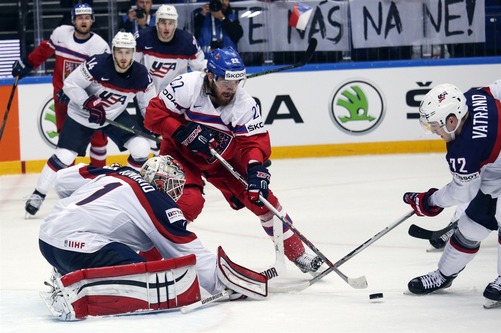 Český útočník Lukáš Kašpar v šanci před americkým brankářem Keithem Kinkaidem.