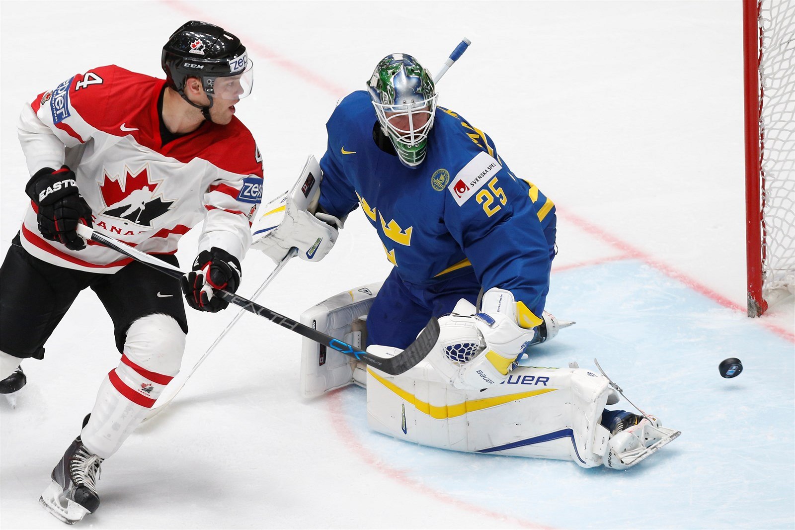 Tyler Hall z Kanady právě skóruje ve čtvrtfinále MS 2016 se Švédskem