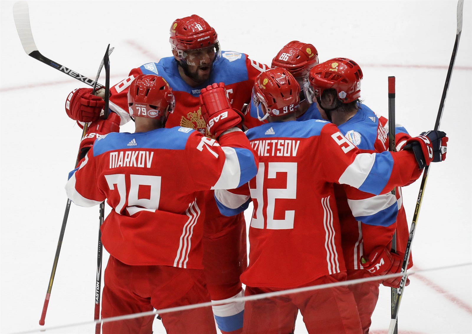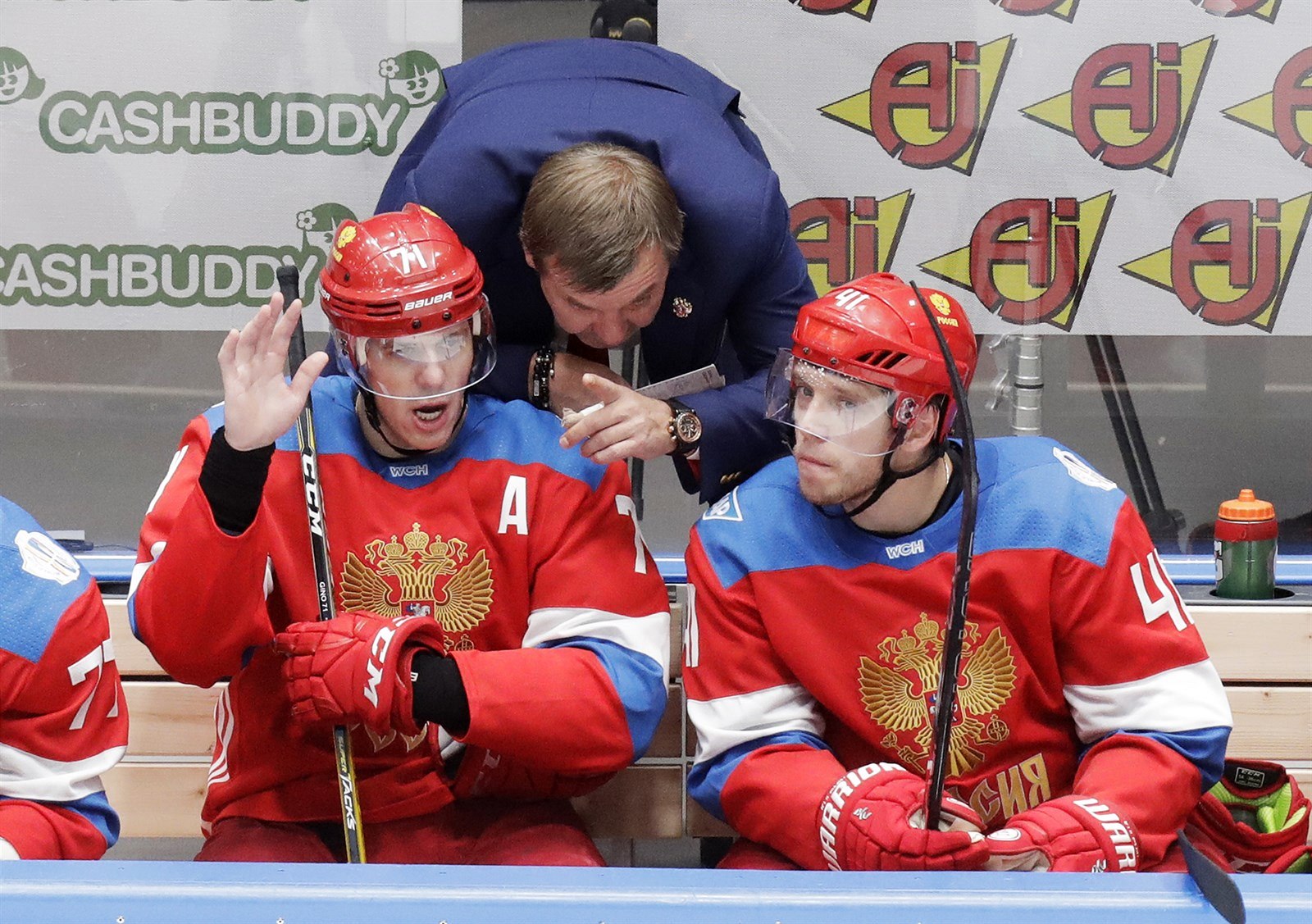 Ruský trenér Oleg Znarok při konzultaci s Jevgenijem Malkinem a Nikolajem Kuljominem.