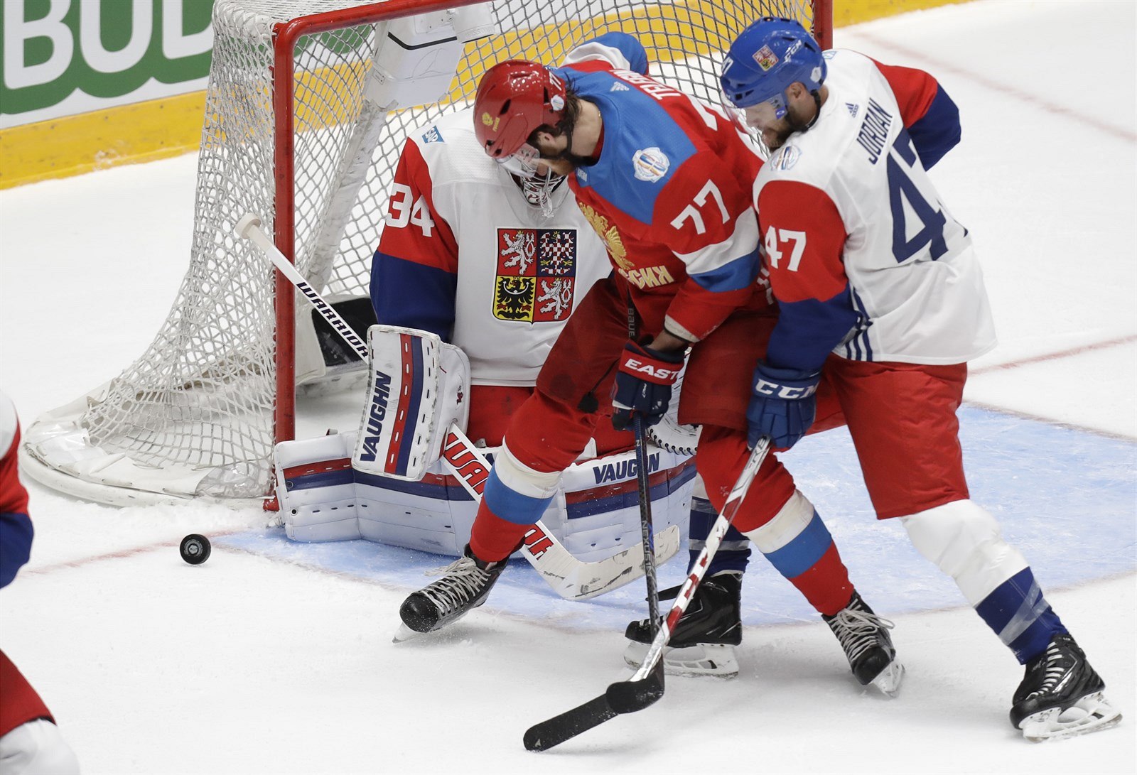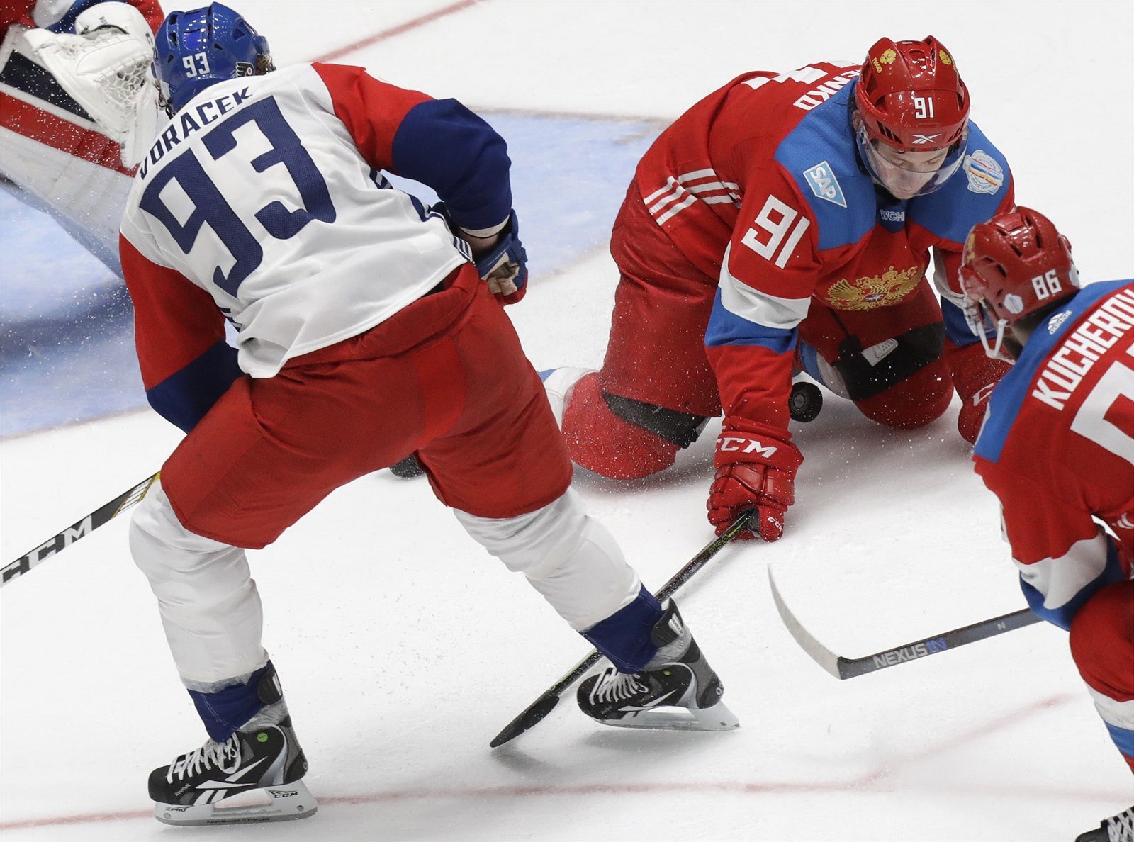 Jakub Voráček se pokouší najít puk mezi ruskými obránci.