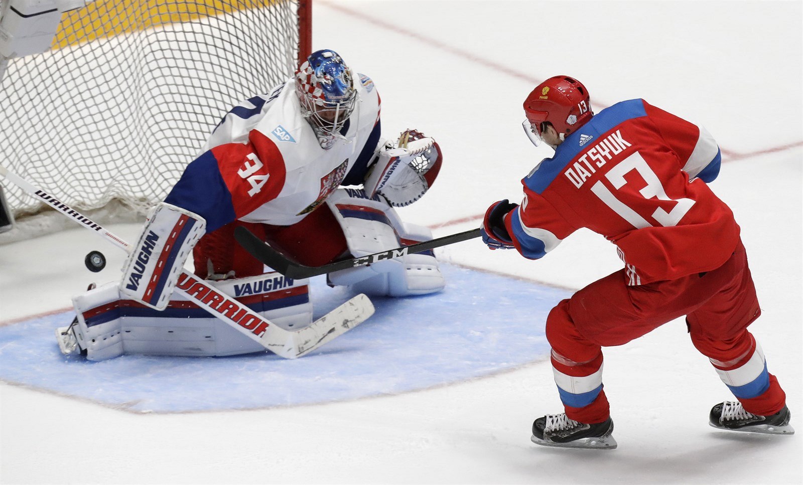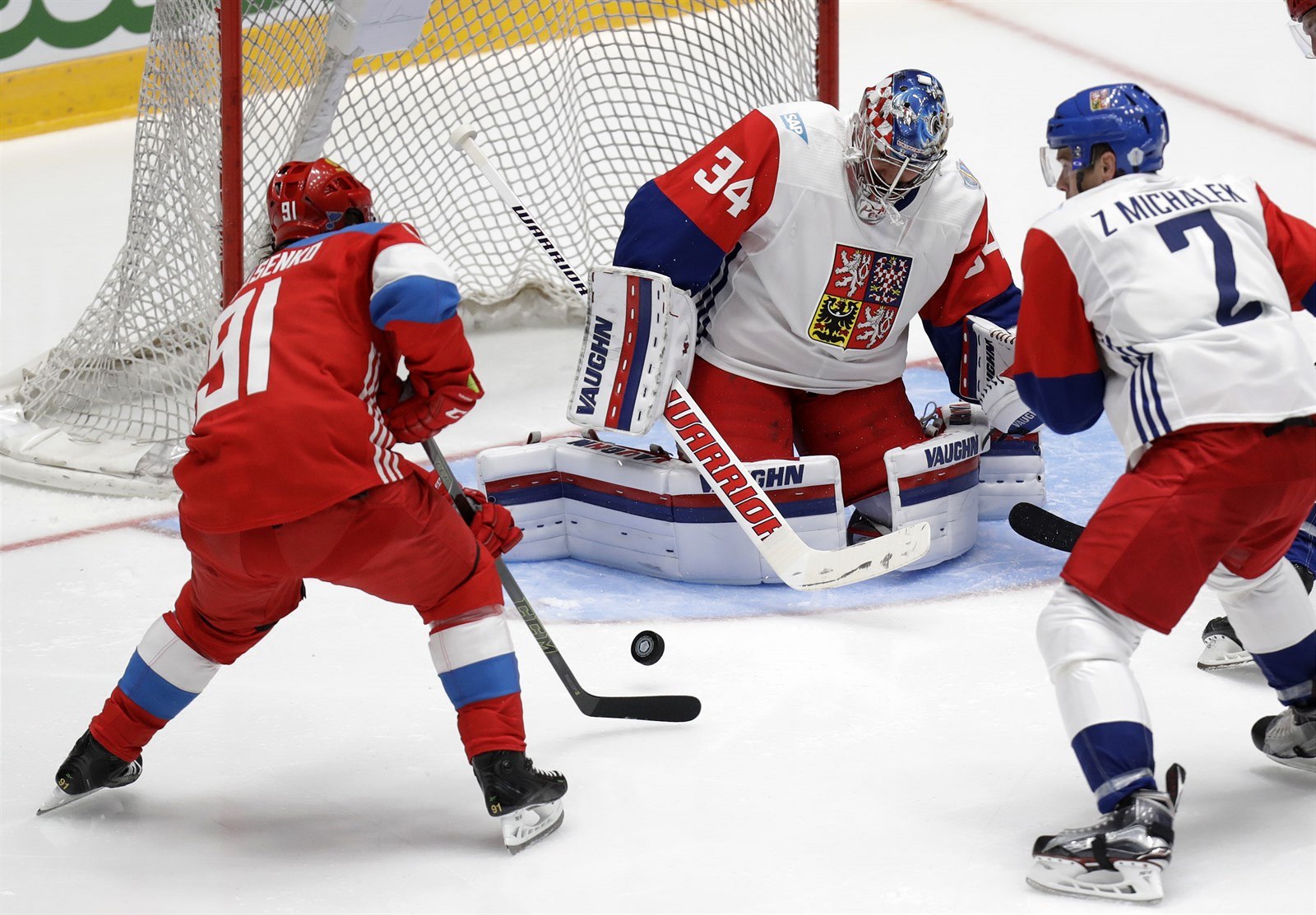 Český brankář Petr Mrázek maří příležitost Rusa Pavla Dacjuka.