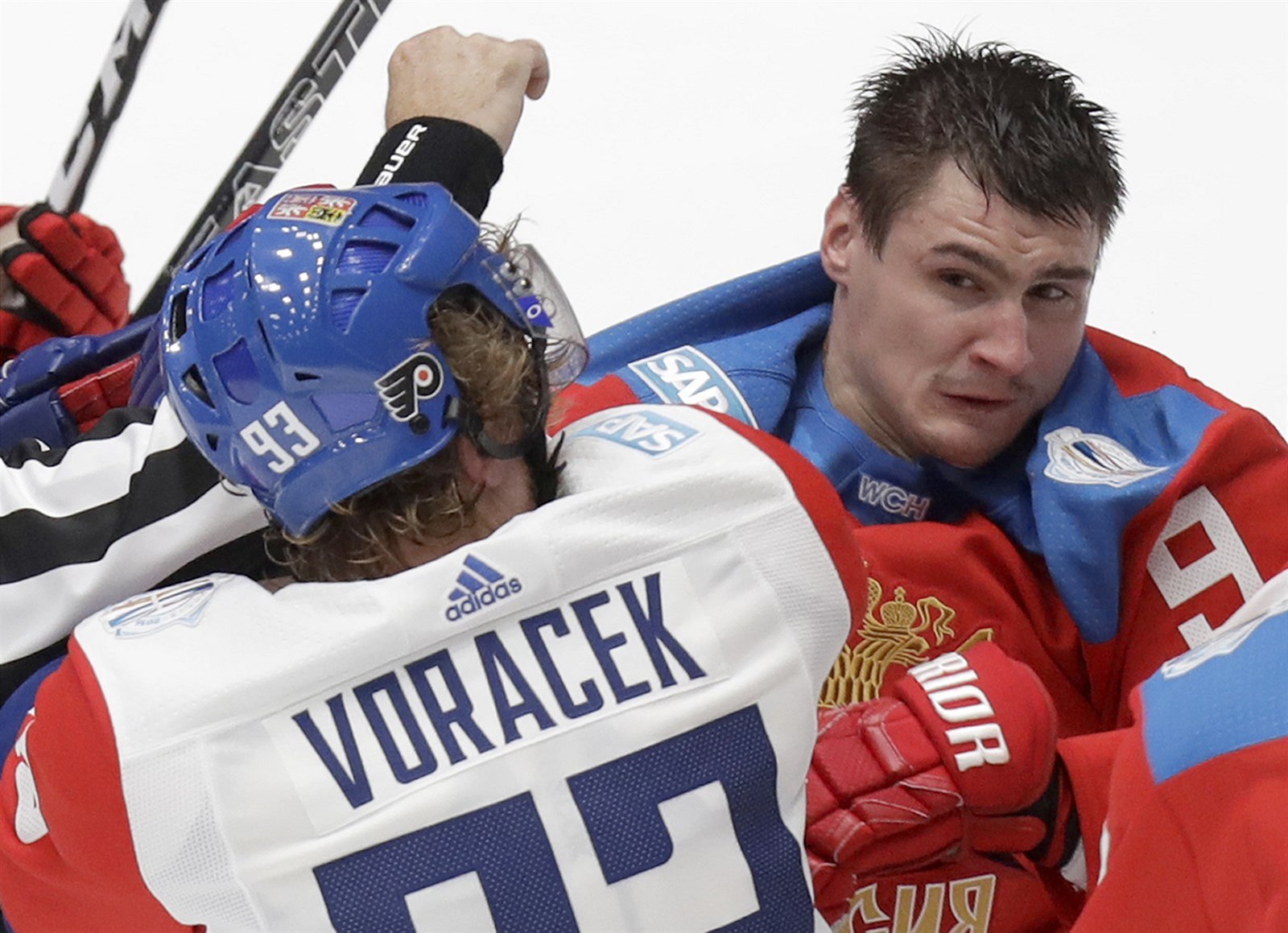 Jakub Voráček v potyčce s Rusem Dmitrijem Orlovem.