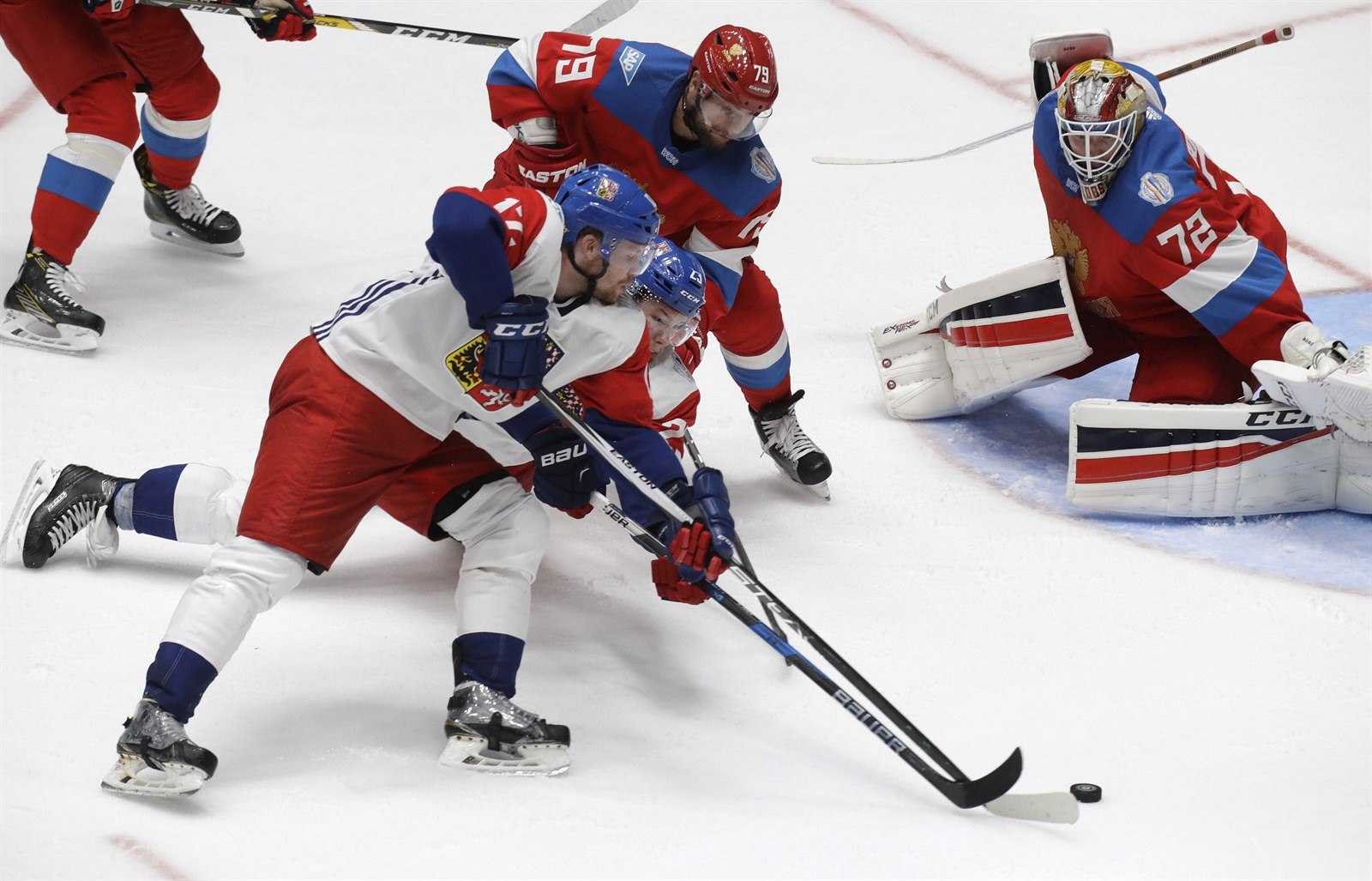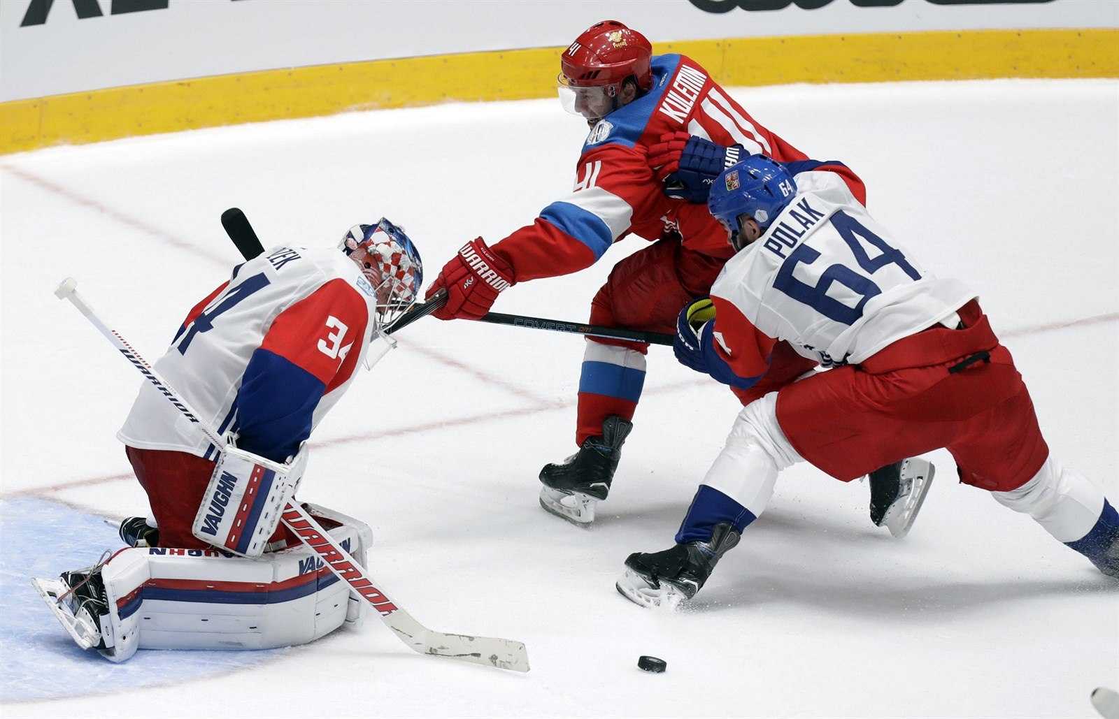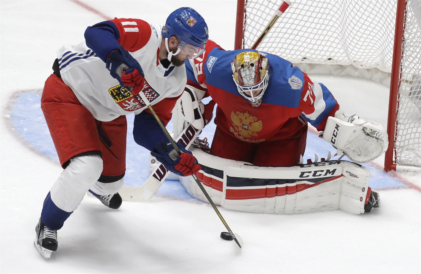 Český brankář Petr Mrázek maří šanci Nikolaje Kuljomina, na kterého dotírá Roman Polák.